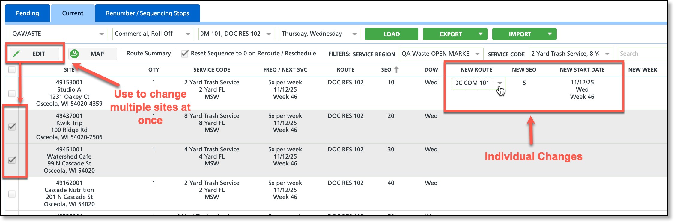From the Current tab, users can quickly make route modifications to one or multiple locations at a time using features available on the screen.