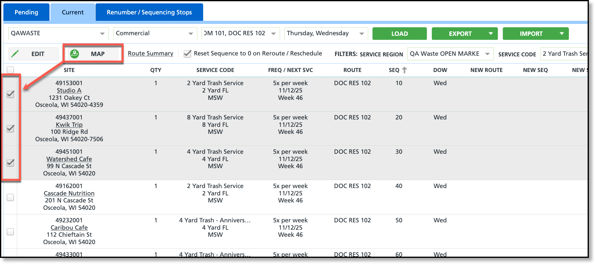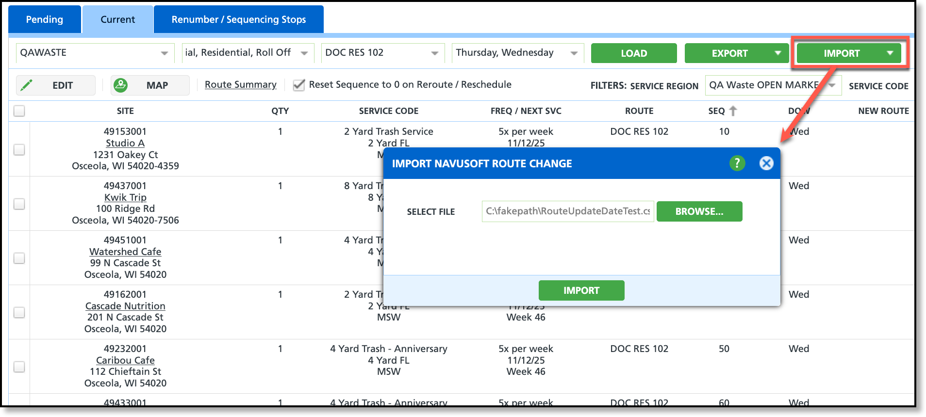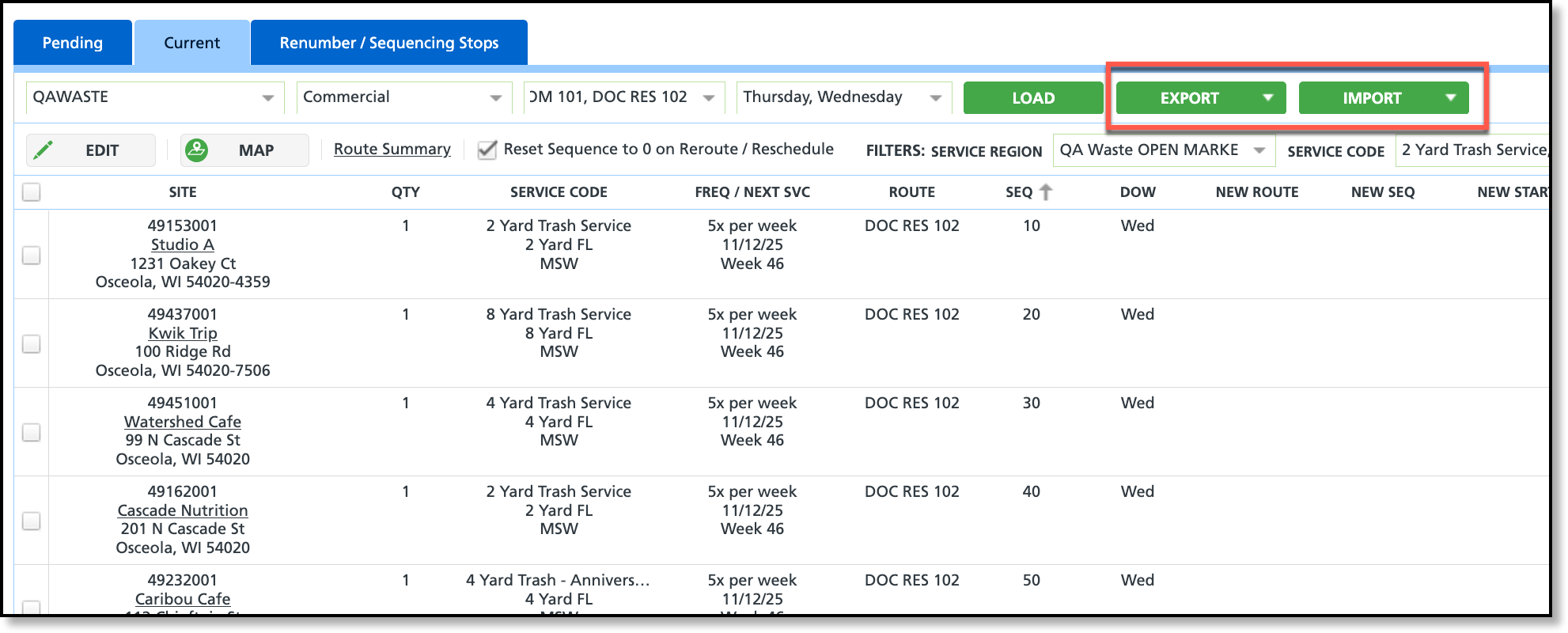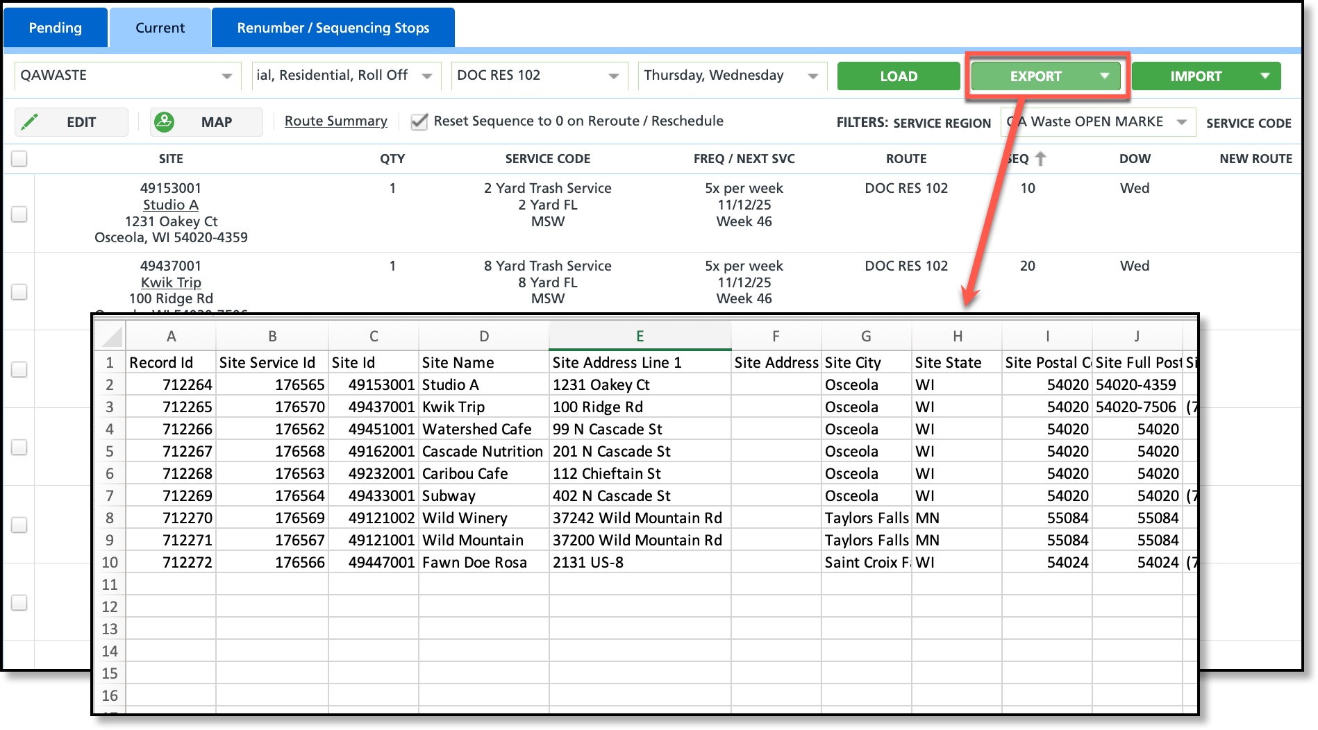 Filter the screen to load only the routes intended for export. Once the screen loads, select the export option that aligns with the process. The data for each service location will be exported in .csv format, allowing for route information edits.