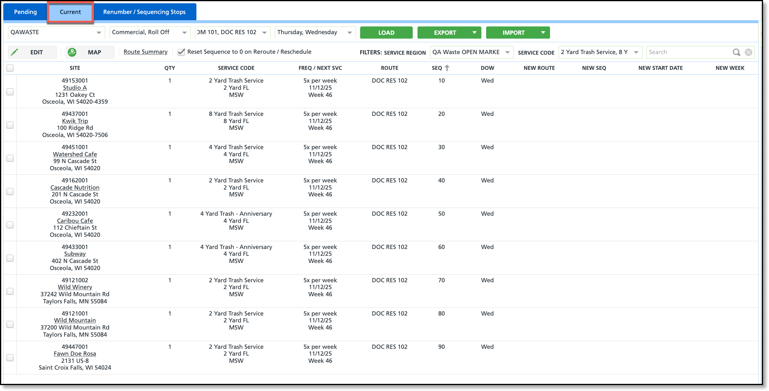 The Current tab displays a list of service locations (stops) assigned to a route. Changes made to a stop from this tab are permanent. For one-time changes, use the Dispatch tool under Operations instead.