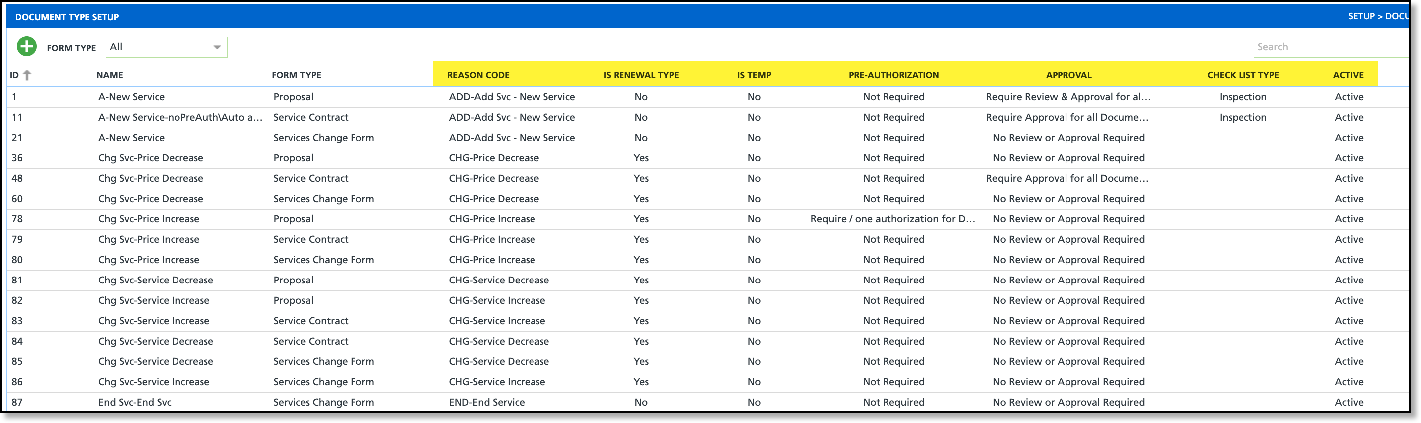 The Document Type Setup screen has been updated to allow settings to be edited directly from the grid. Previously, changes could only be made through the Update Document Type popup editor, accessed by double-clicking the document type row.
