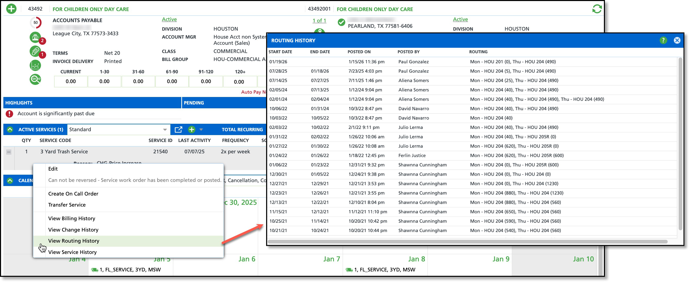Pathway: Customer Service Screen > Active Services [section] > [right click] View Routing History