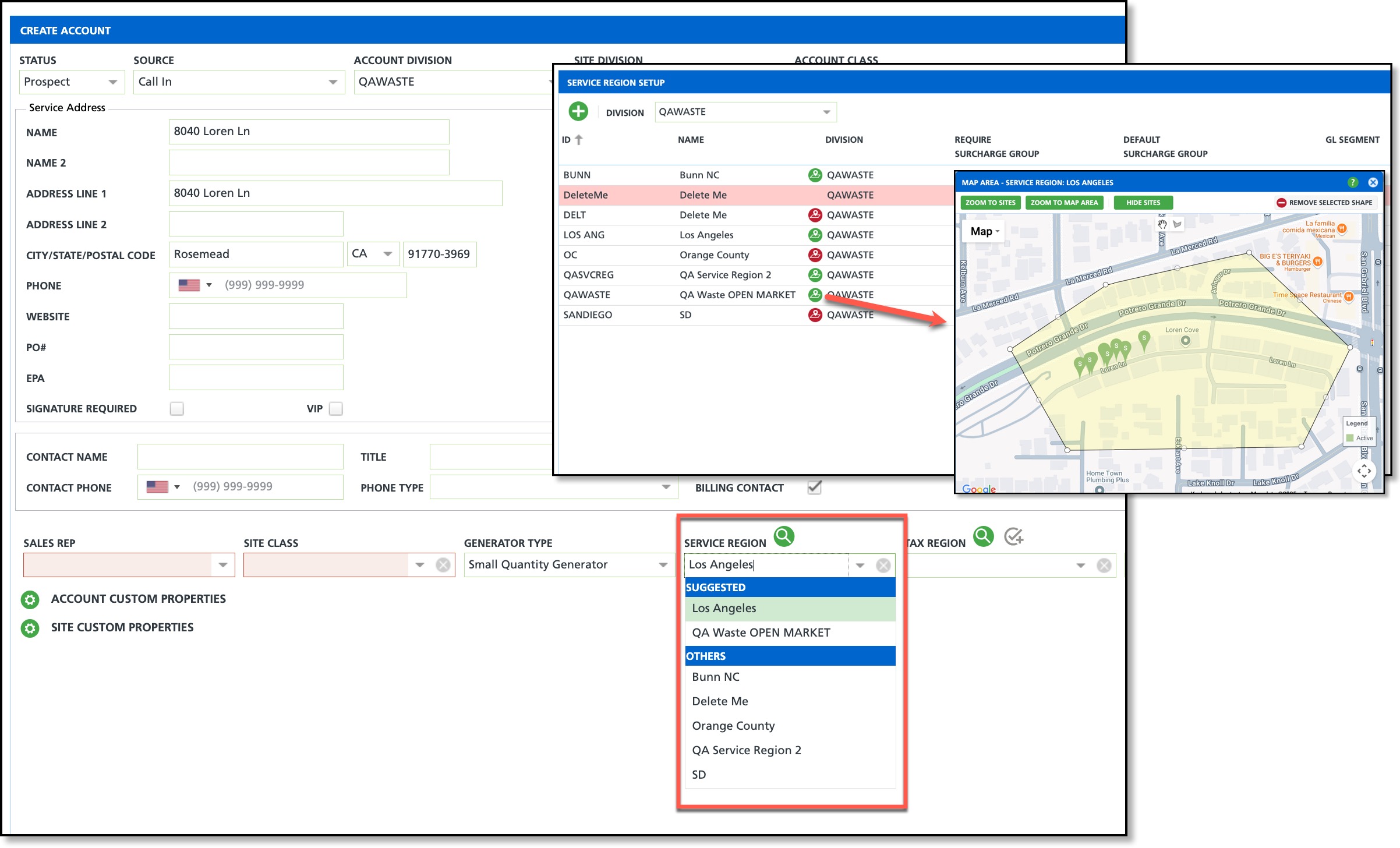 Suggested Service Regions have been added to the Add Account and Add Site screens. Suggested regions are determined based on the address's latitude and longitude, falling within the polygon defined in Service Region Setup.