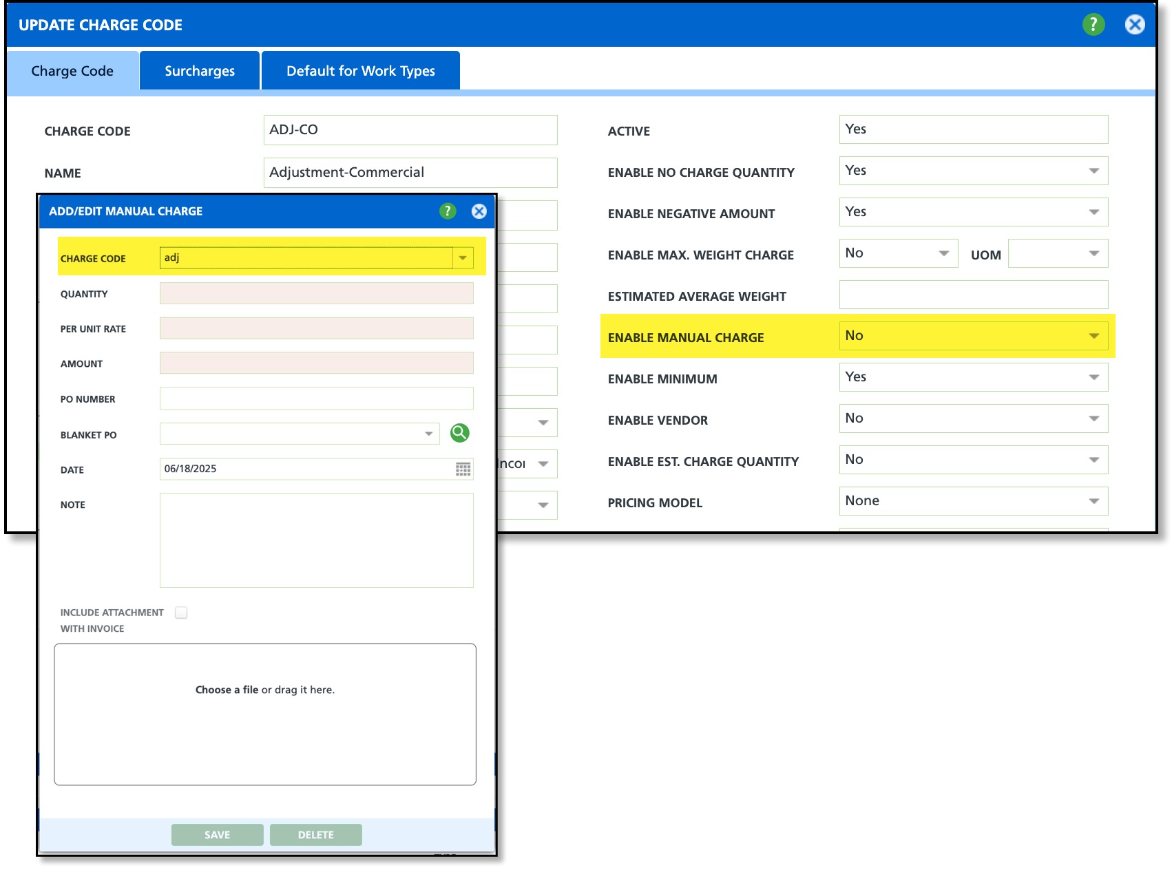 The logic for the Charge Code field in the Add/Edit Manual Charge screen has been updated to prevent charge codes without "Enable Manual Charge" set to "Yes" from appearing when using the field as a search box.