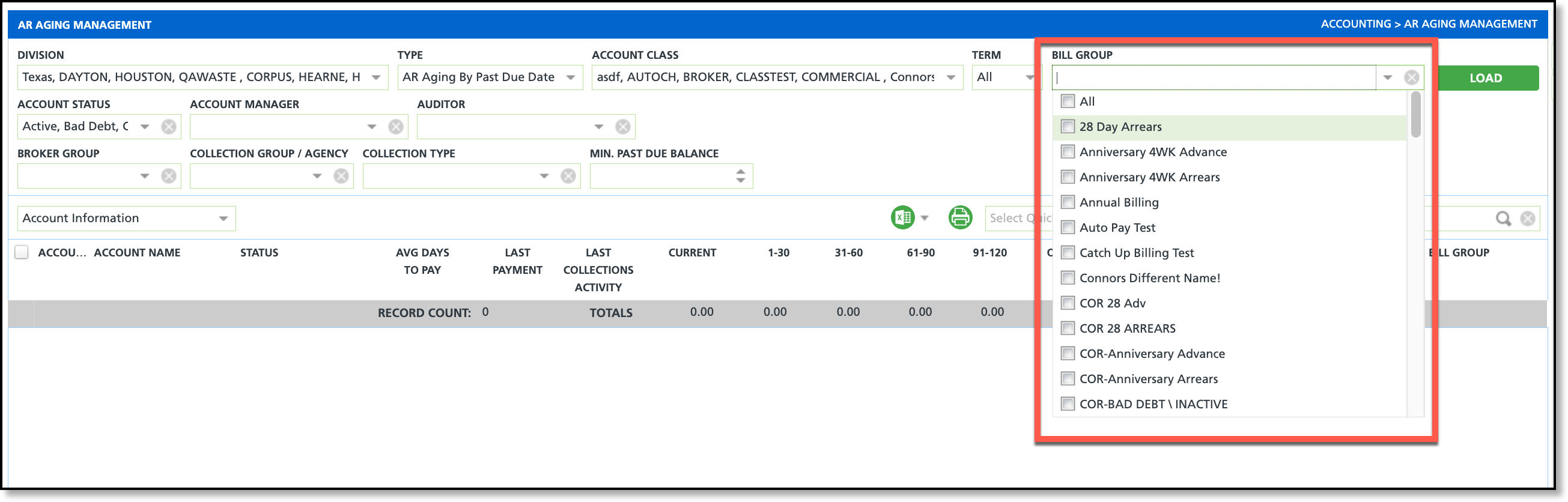 The Bill Group filter on the AR Aging Management screen has been enhanced to allow for multiple bill group selections.