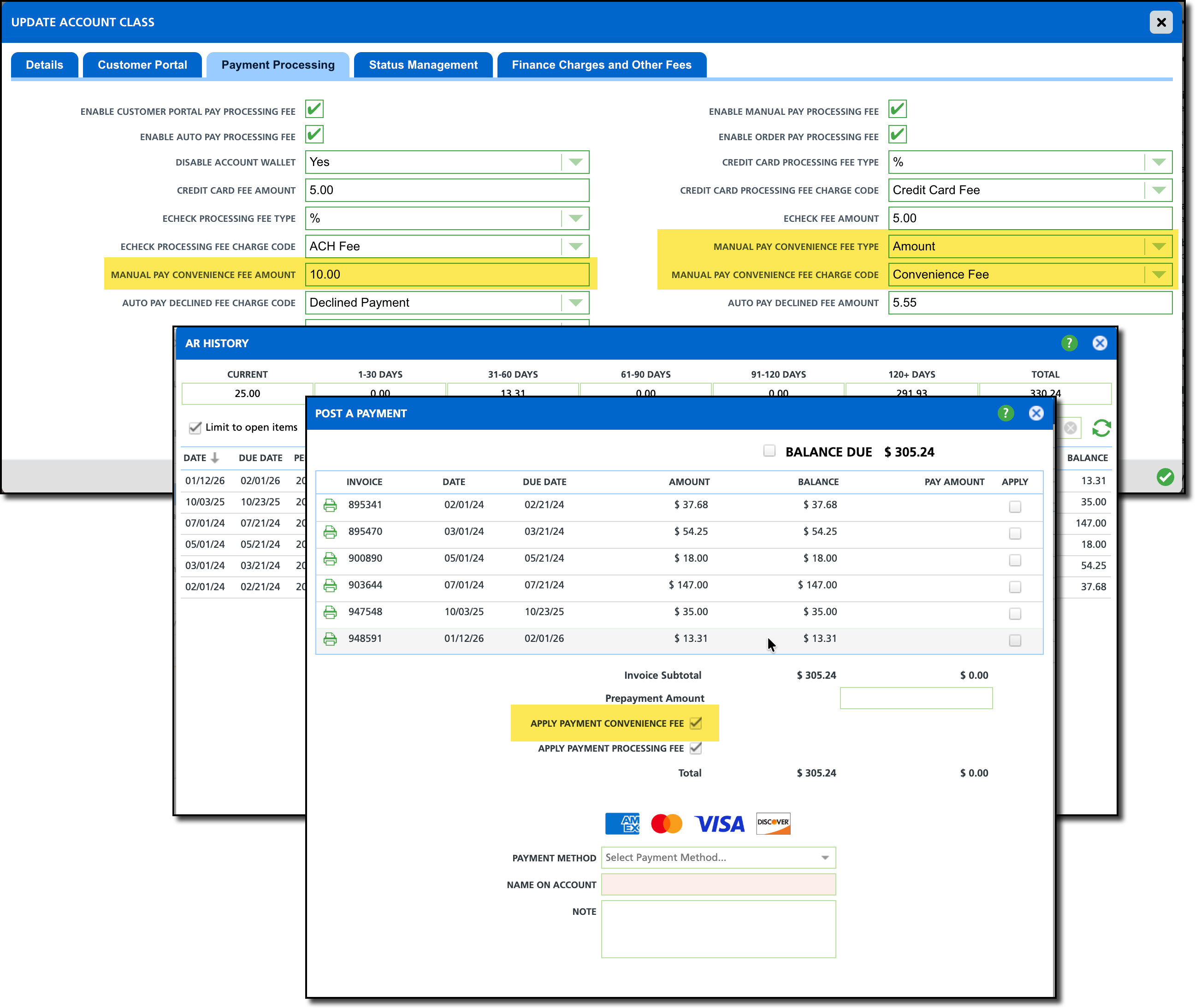 Once setup is complete, the process to apply the convenience fee is simple and is only available in AR History when manually posting a payment.