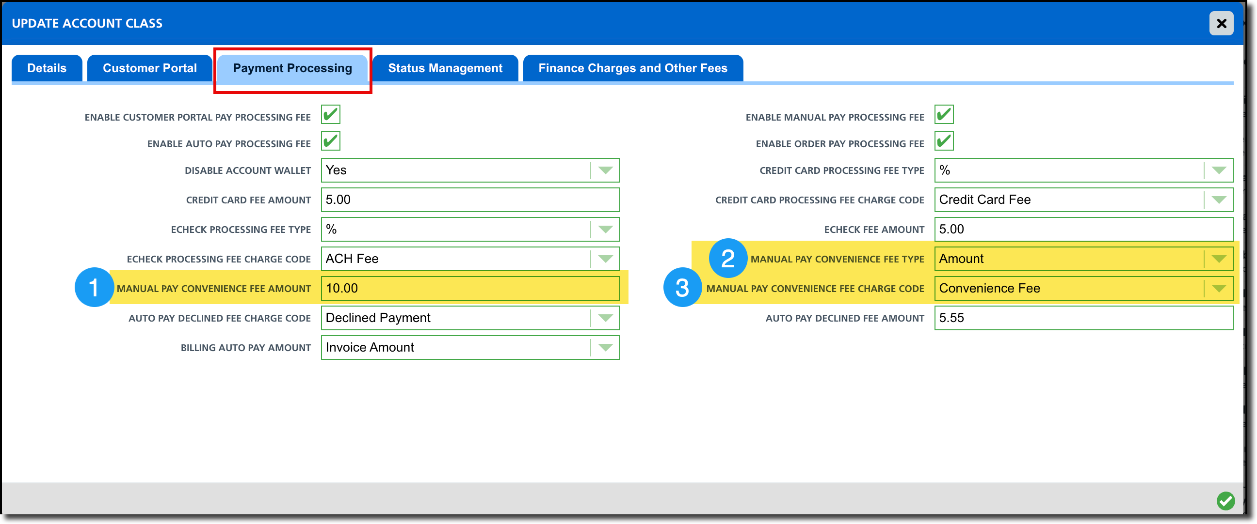 Open the Account Class the convenience fee applies to and navigate to the Payment Processing tab. In there, review the following settings to match your convenience fee requirements.