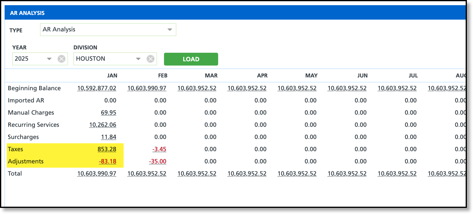 The logic for Adjustments and Taxes in the AR Analysis report has been updated to separately report any taxes included in an adjustment in the Taxes line. Previously, the taxes for adjustments were being included in the adjustments total line.