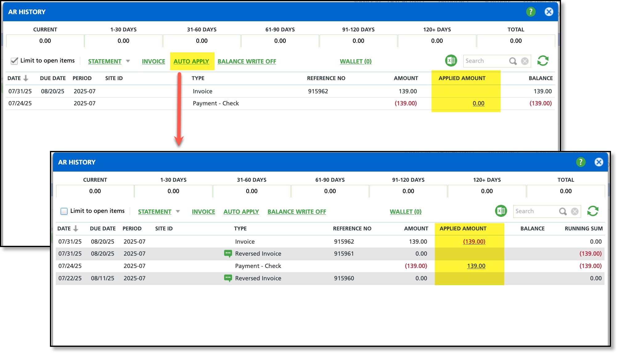An issue has been resolved that prevented the Auto Apply link in AR History from applying unapplied payments to open invoices.