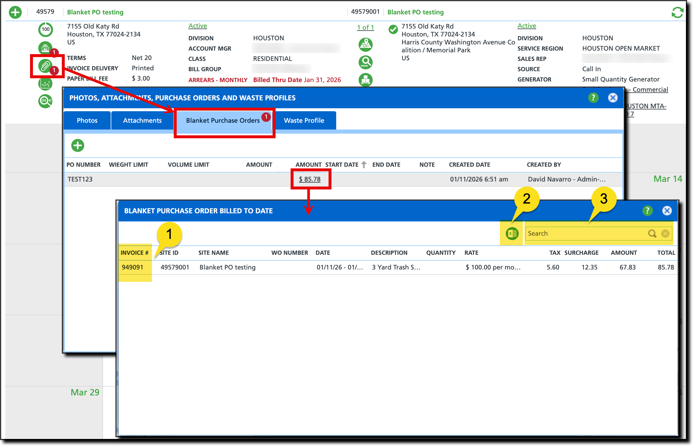 Customer Service > View Photos, Attachments,...icon (paperclip) > Blanket Purchase Orders tab > Amount Billed To Date hyperlink