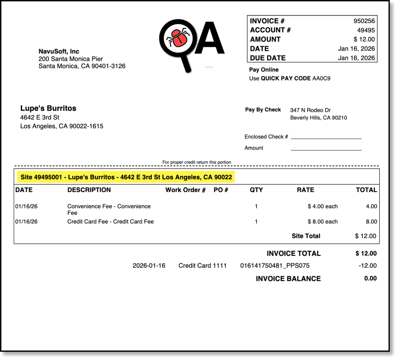 An issue has been resolved where invoices generated for merchant processing and convenience fees were missing key account details. The account “mail to” header, site header, and invoice detail line items were not displaying on these invoices.