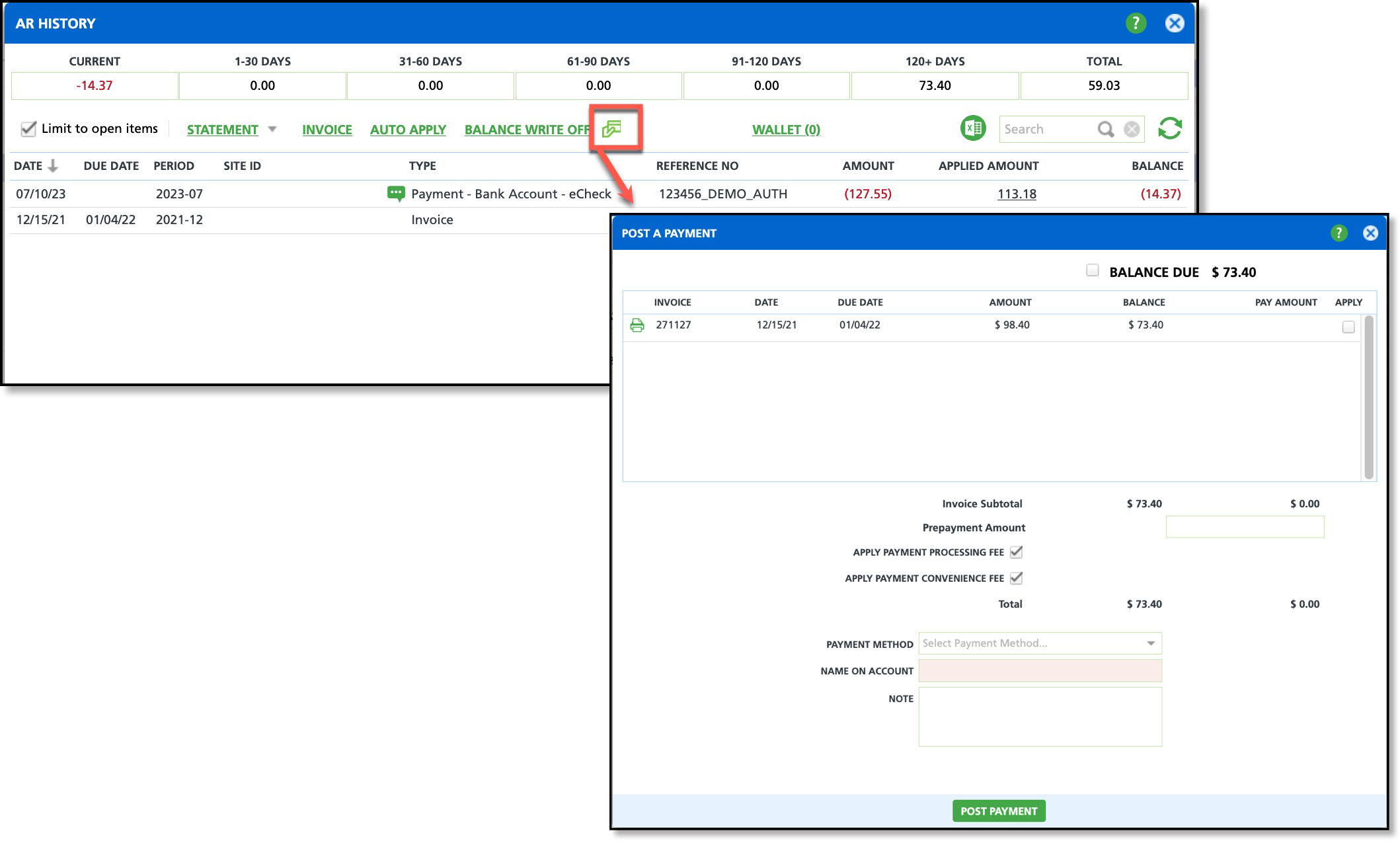 Quickly post a payment to a customer’s account using the Post a Payment feature in AR History. When entering a payment, optional settings configured in the account class—such as Apply Payment Process Fee and Apply Payment Convenience Fee—can be enabled or disabled as needed.