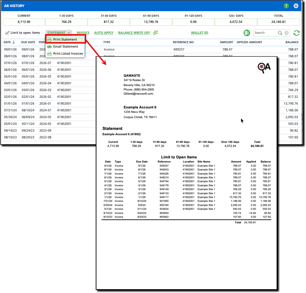 The Print Statement option will output the AR History Details matching the limit to open items setup selection.