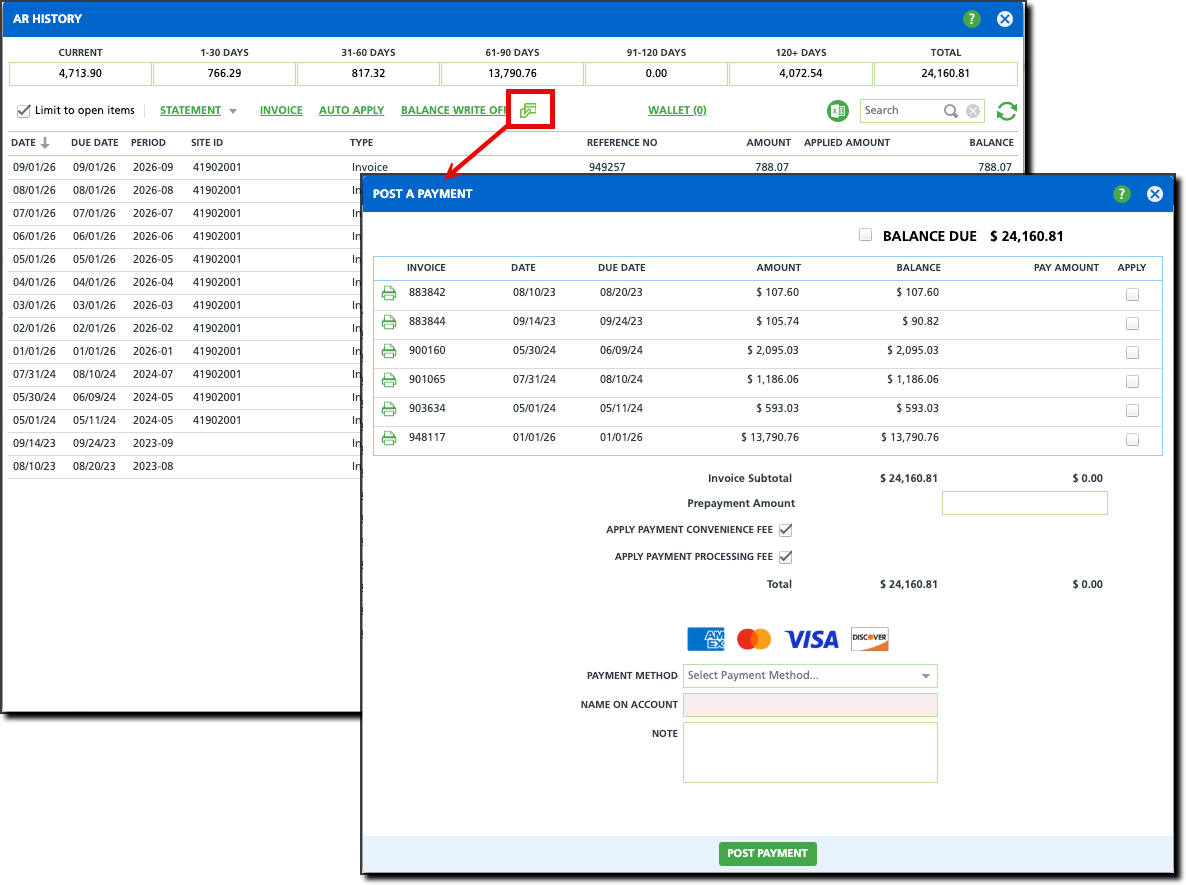 The AR History screen displays an account's balance for services they have received. In addition, AR History is used to manage the account's payment methods, post a payment and generate an invoice for.