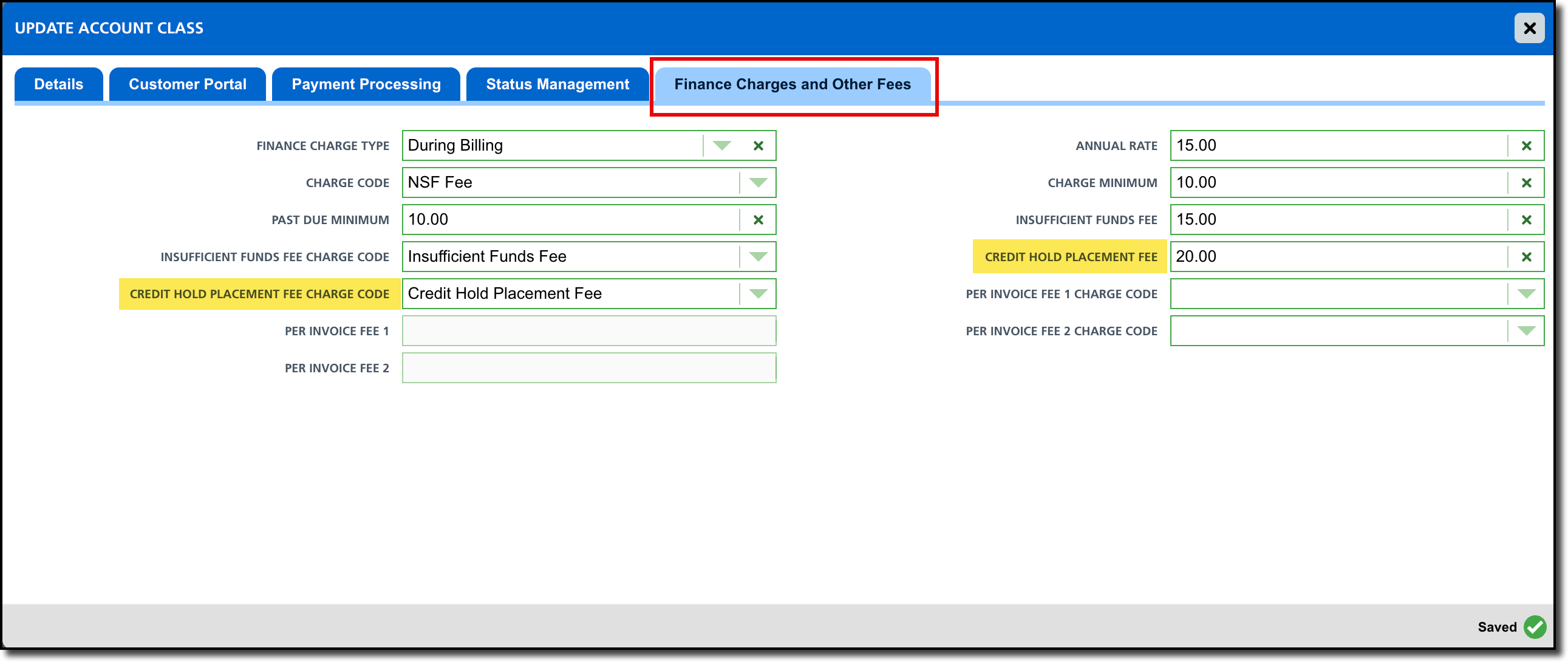 | Credit Hold Placement Fee | If a fee should be applied when an account is placed on credit hold, enter the fee amount here. |