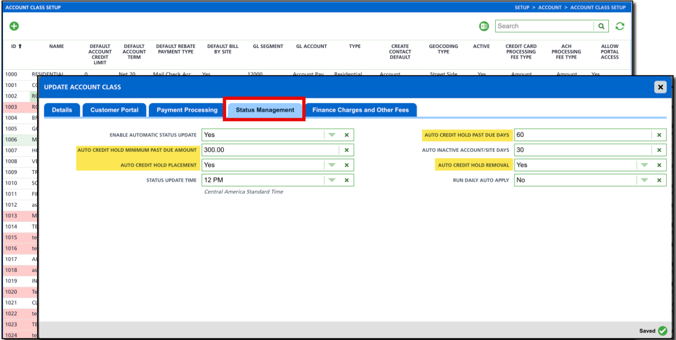 Automating credit hold status is managed at the account class level. Review the settings in both the Status Management and Finance Charges & Other Fees tabs when configuring auto-credit holds.