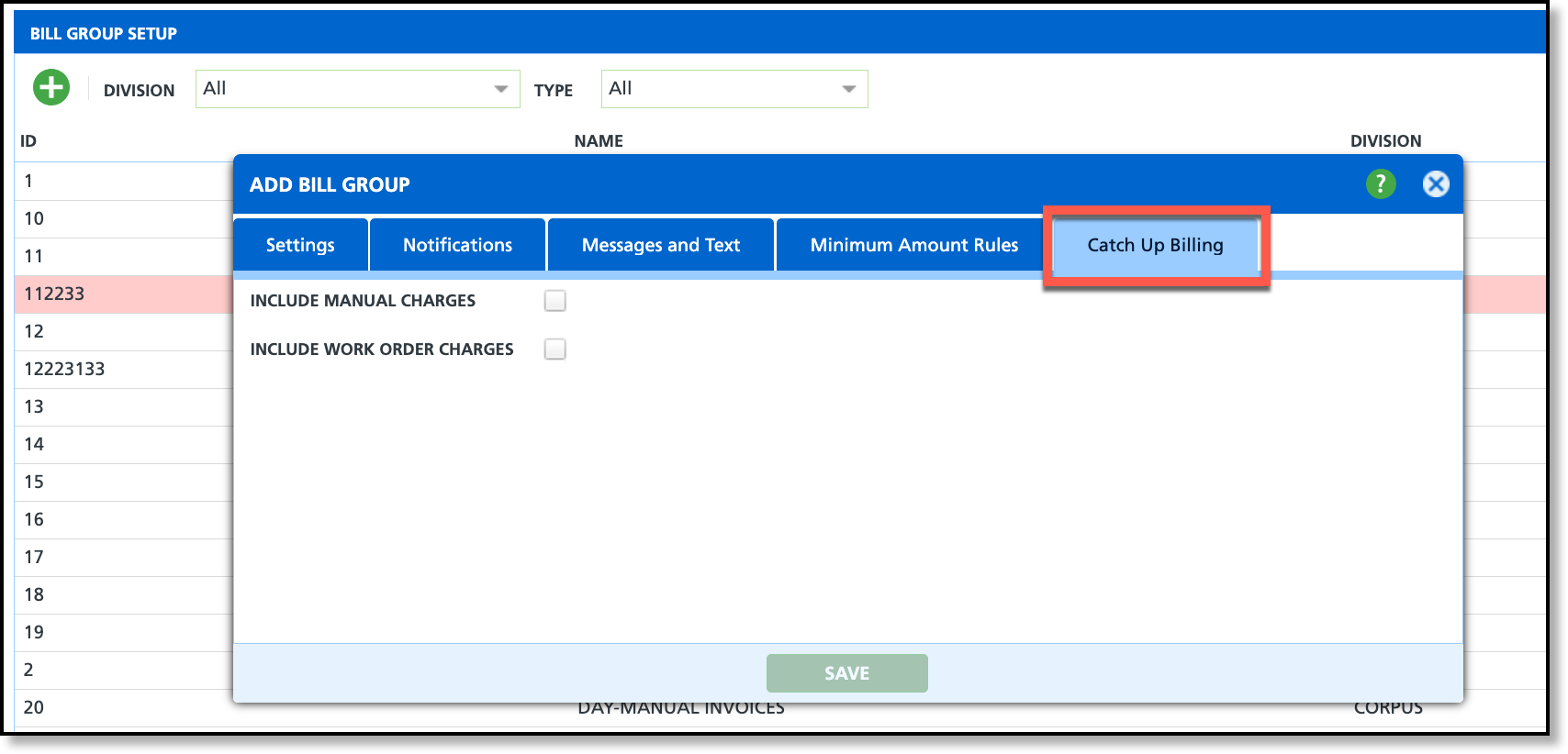 To support this, a Catch Up Billing tab has been added to the Bill Group Setup screen. For each bill group that should include the Catch Up Billing option, select which charges should be included.