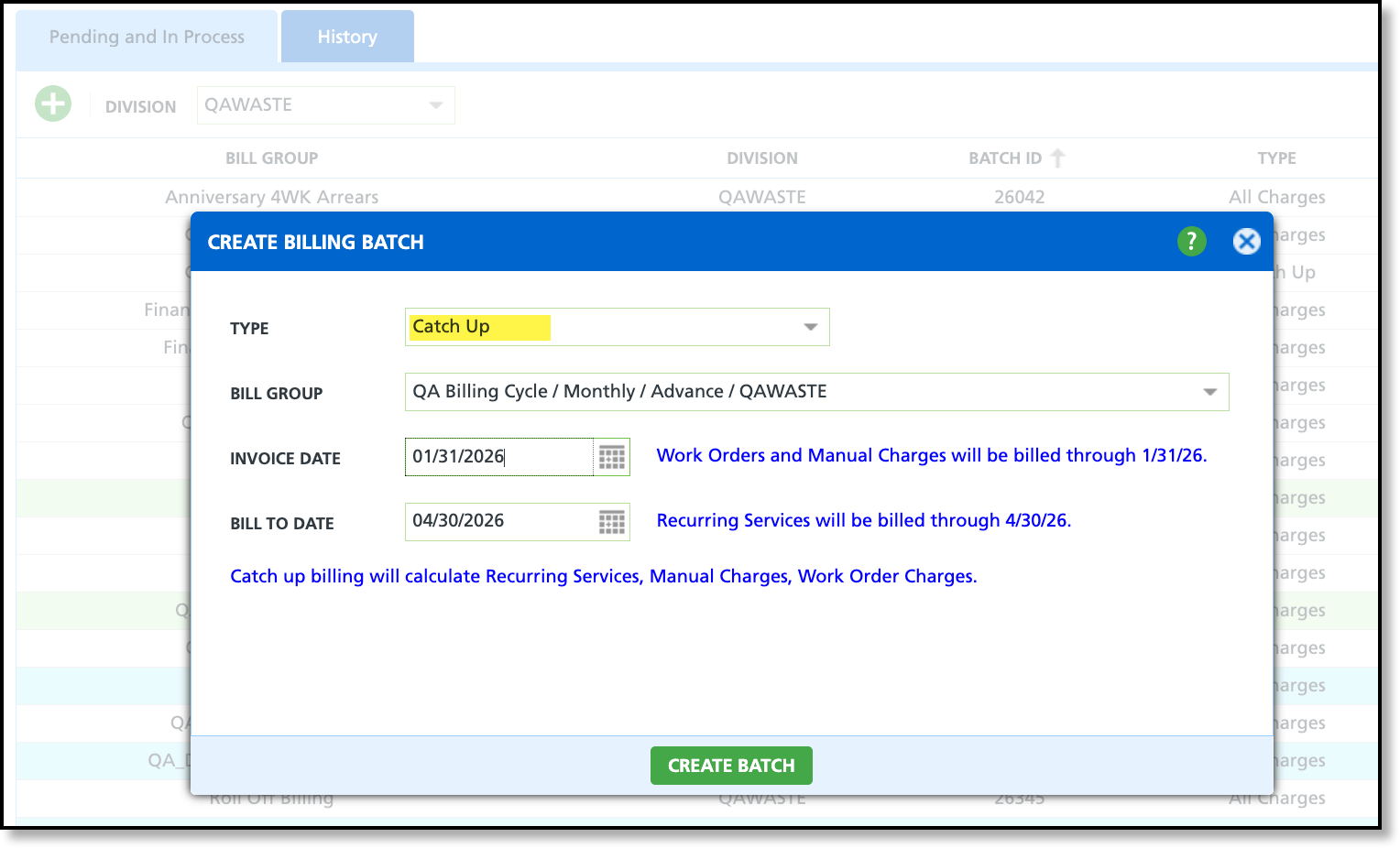 In the Create Billing Batch window, a new Catch Up option has been added to the Type drop-down. When selected, a Bill Group, Invoice Date, and Bill To Date are required. Based on the Catch Up Billing settings enabled for the selected bill group, informational messaging is displayed alongside the date fields to indicate what will be billed for the specified time period.