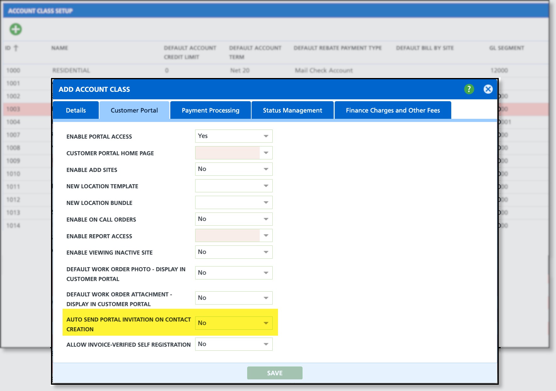 A new field, "Auto Send Portal Invitation on Contact Creation," has been added to Account Class Setup. When enabled, it automatically sends a portal invitation to contacts upon creation, provided a valid email address is entered.