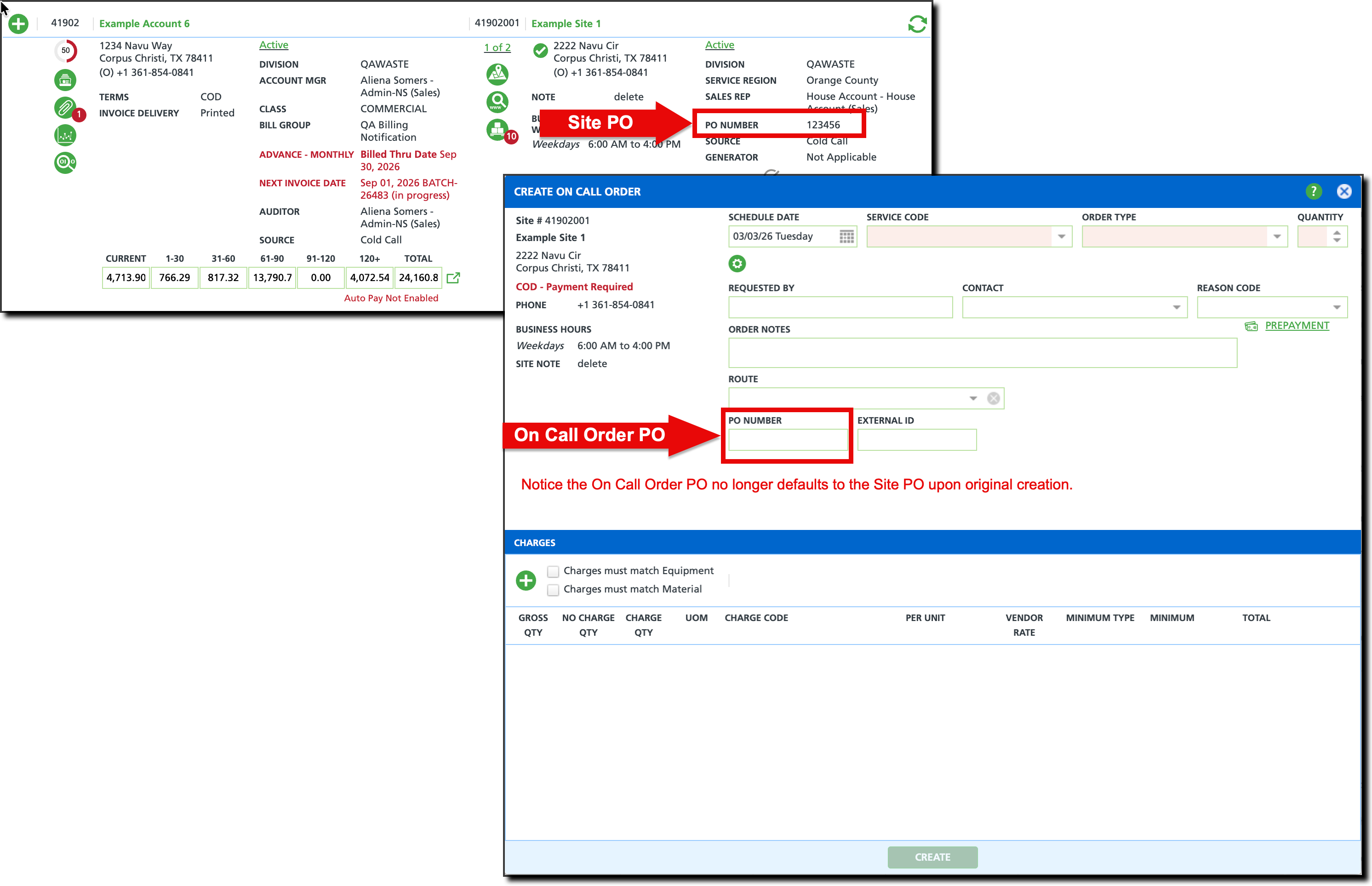 Updated logic for the Create On Call Order process so that the on call order PO number is no longer preloaded with the site PO number upon initial create.