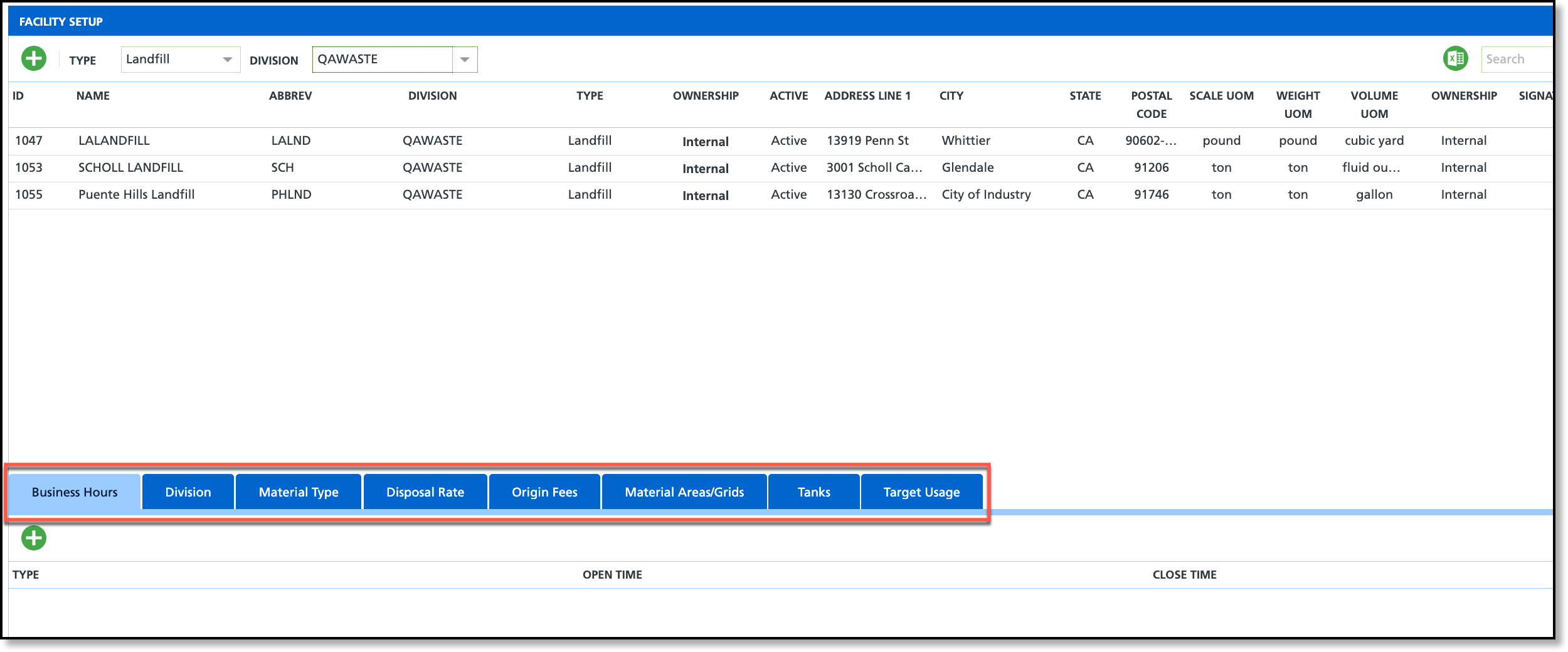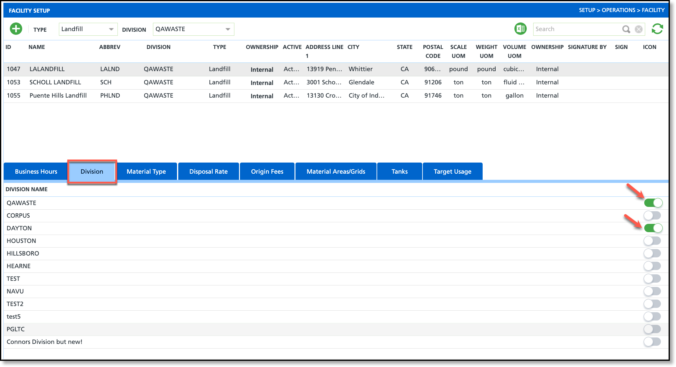 Use the Division tab to link applicable divisions to a facility. When creating an inbound ticket, only items with a division that matches one enabled here will be available for selection. In the NavuNav Driver Application, the Location drop-down for the Add Disposal Entry feature displays only active facilities whose division matches the division assigned to the route.