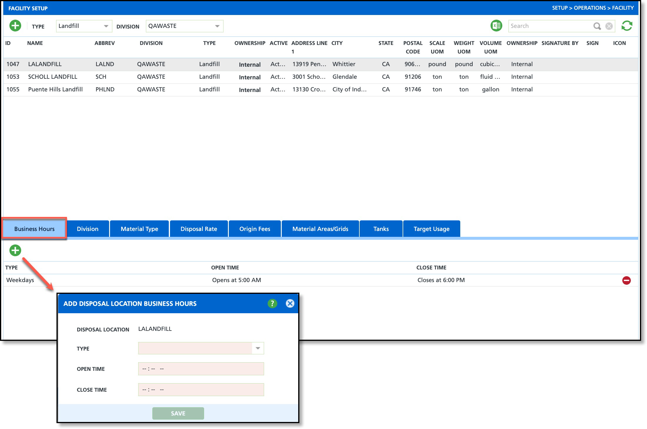 - Select the green '+' icon to display the 'Add Disposal Location Business Hours' editor.