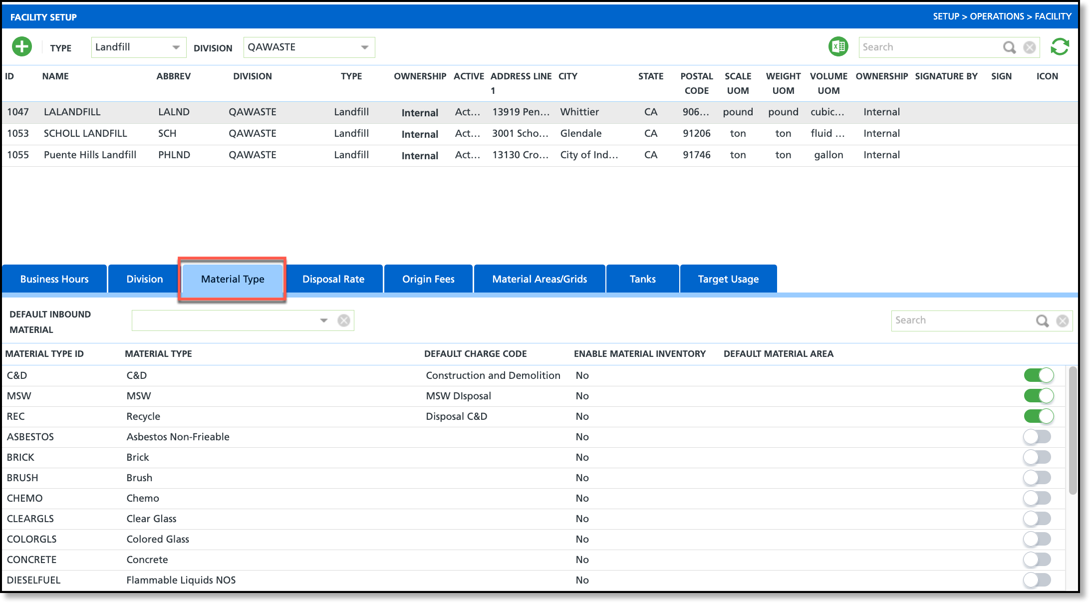 - Only material types enabled on the Material Type tab (within the Facility Setup tab set) are available for selection.