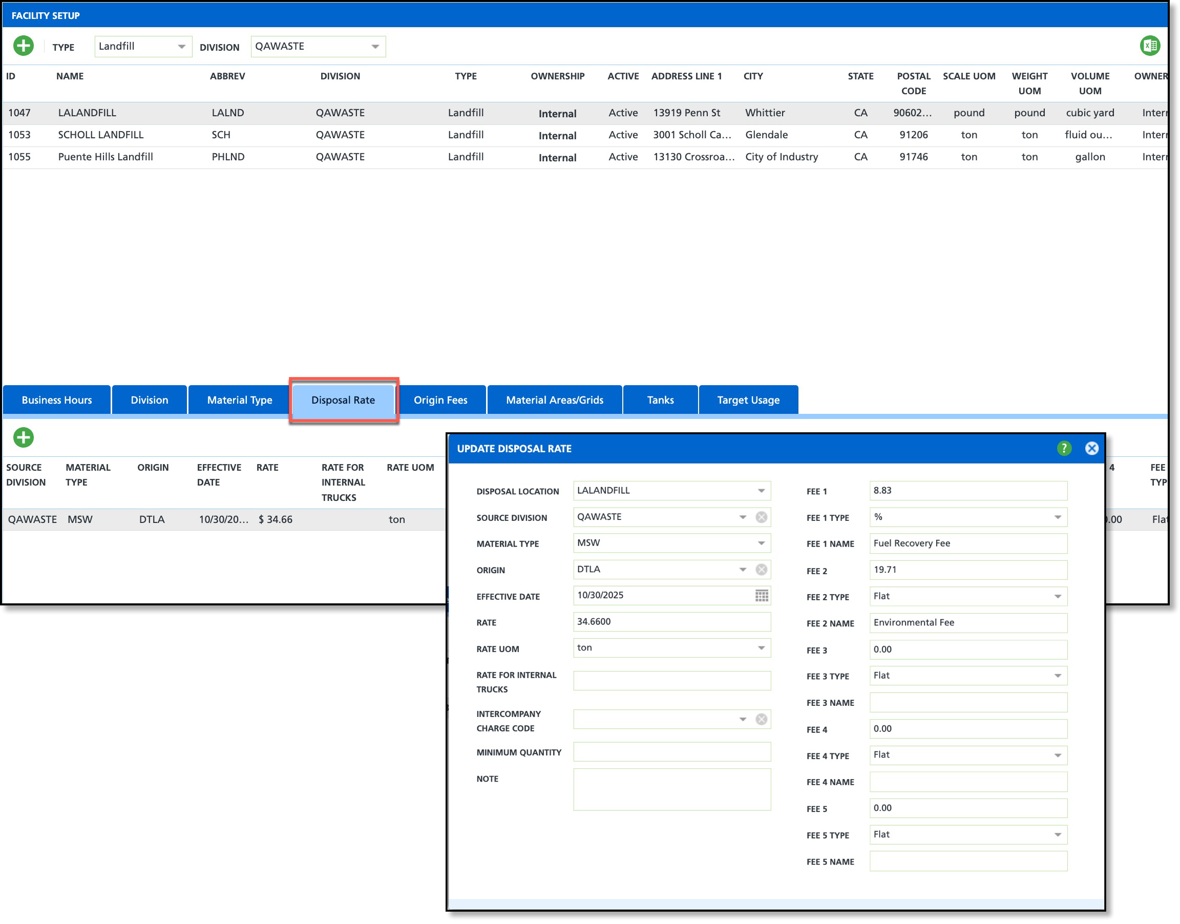 The Disposal Rate tab is specific to a material type at a facility. The rates configured here are used when a Disposal or Ship record is recorded within a service record.