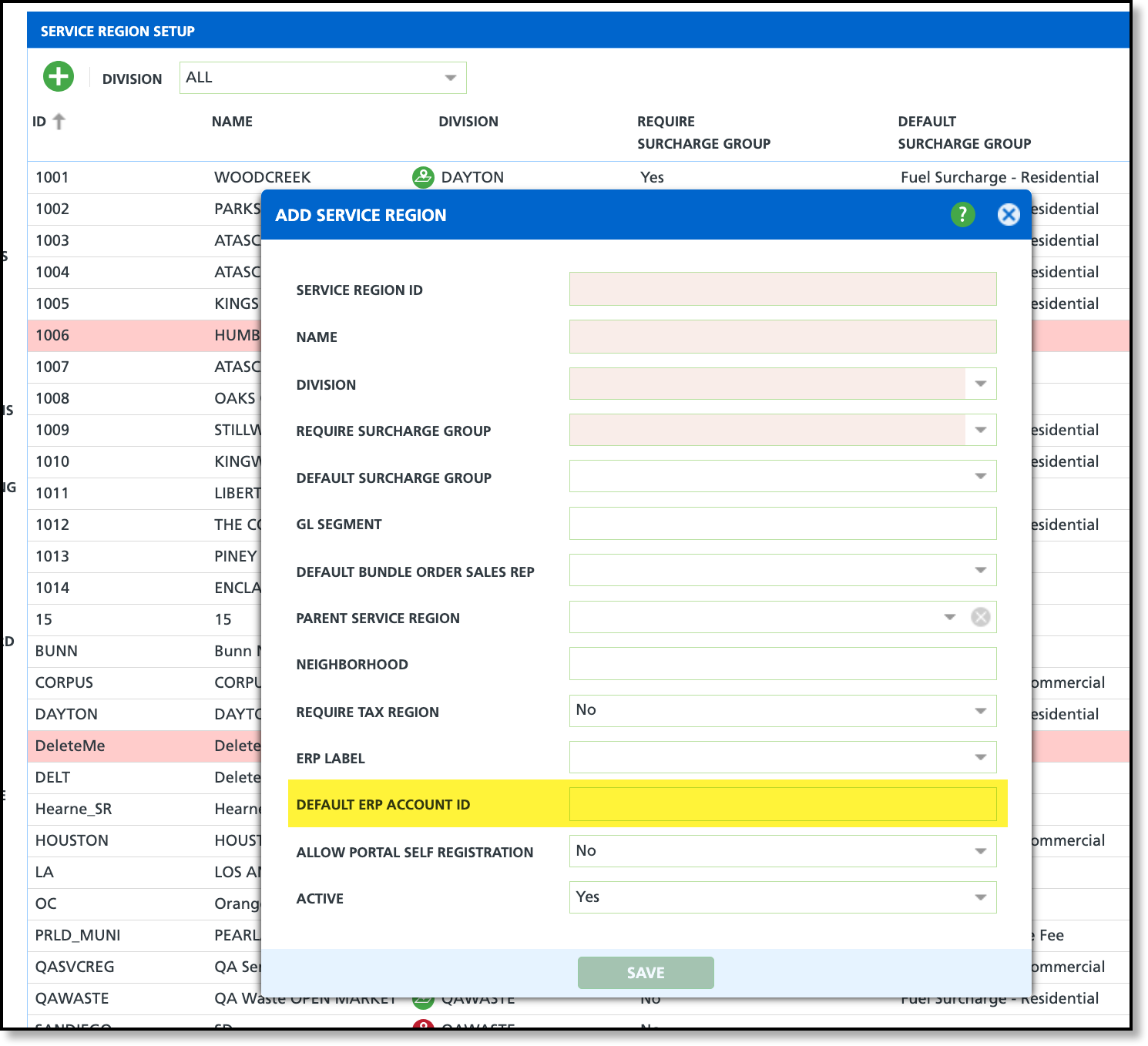 The Default ERP Account ID has been moved from the Division Setup screen to the Service Region Setup screen.