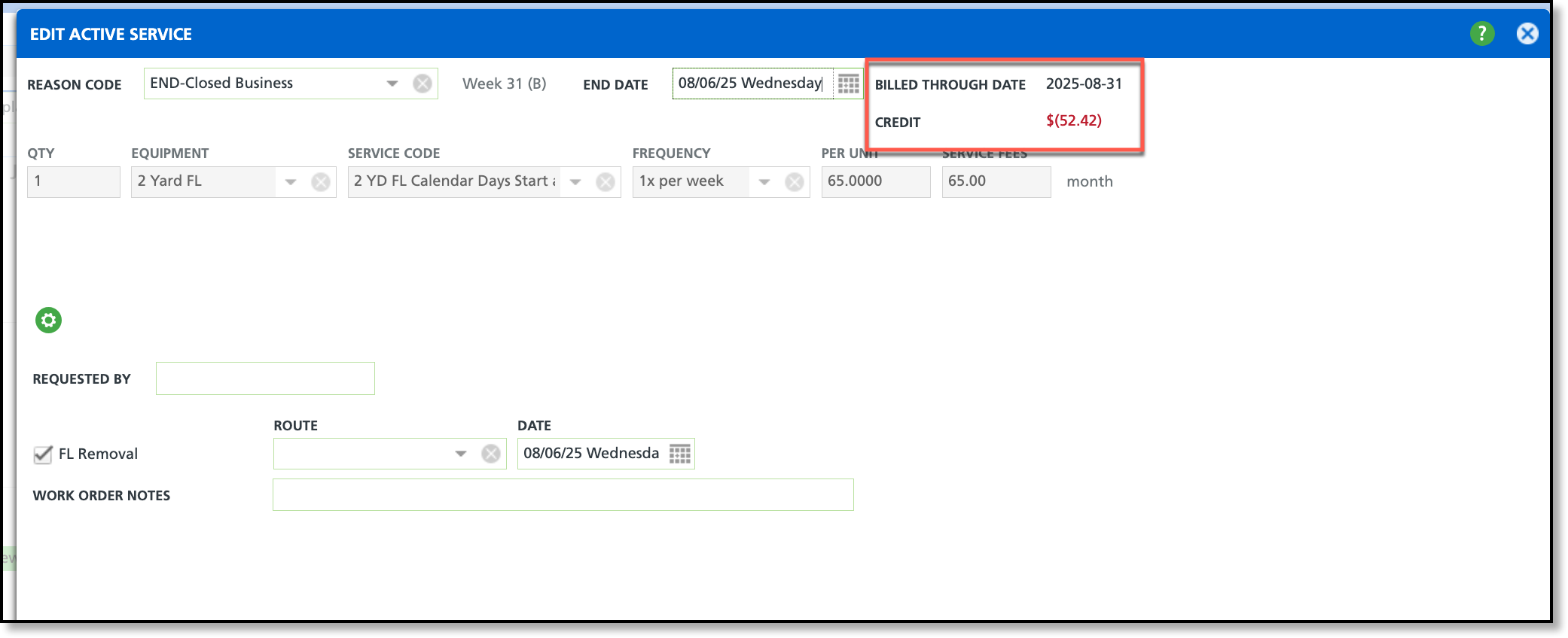 When a service was terminated during a billing period that had already been invoiced, and proration was configured for the service code, the prorated credit amount did not display on the Edit Active Service screen. This has been resolved.