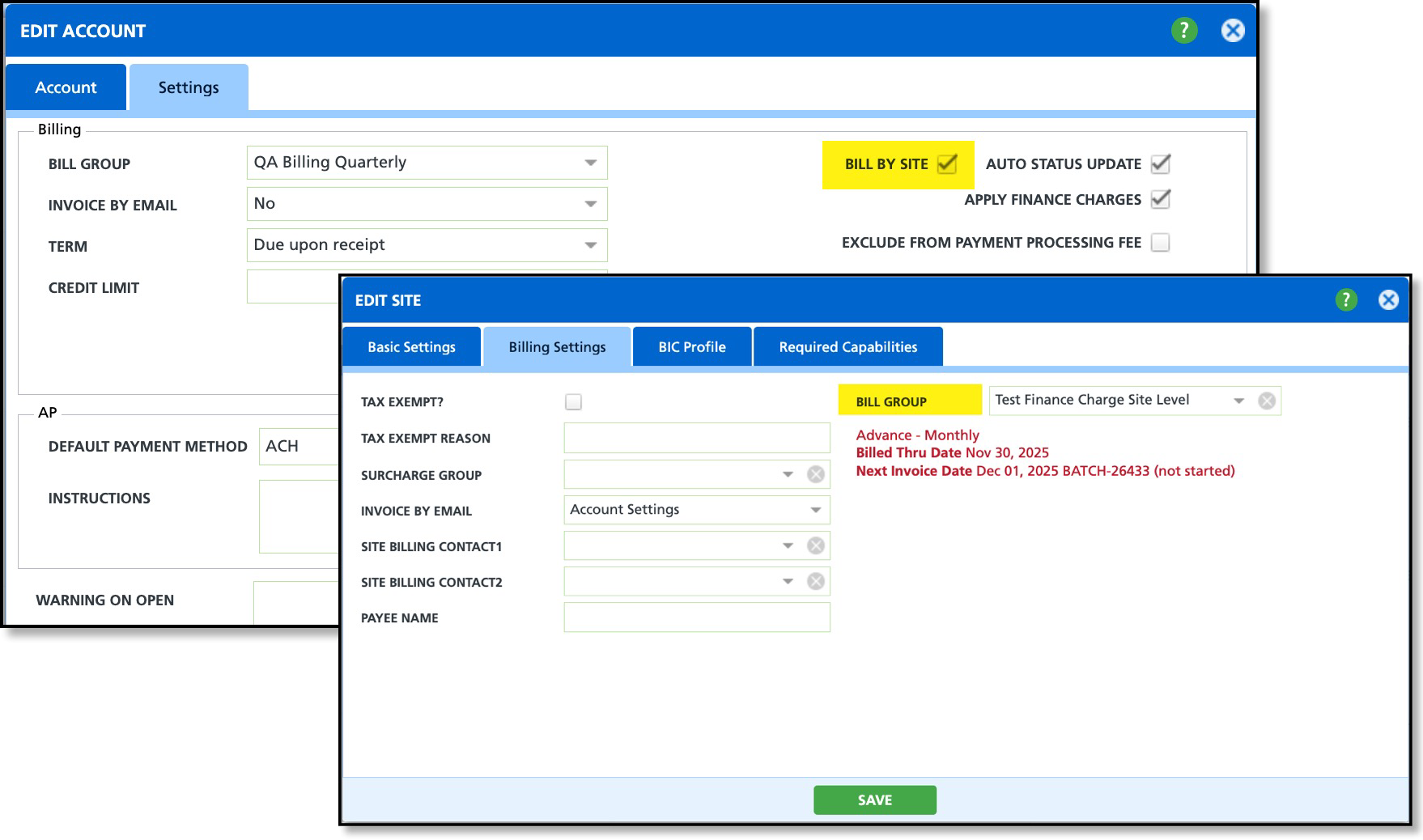 The billing process has been updated for accounts with Bill by Site enabled to apply only site-level finance charges associated with the site’s assigned bill group, excluding account-level finance charges.