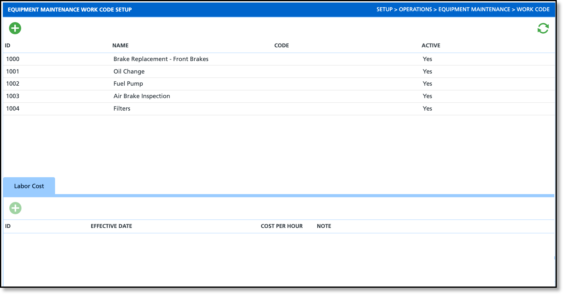 Pathway: Setup > Operations > Equipment Maintenance > Work Code
