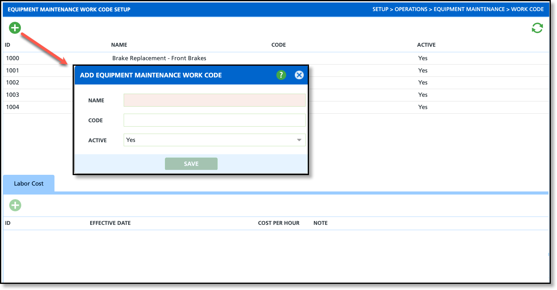 - Select the Add icon under the Labor Cost tab to display the Add Equipment Maintenance Work Code Labor Cost popup editor.
