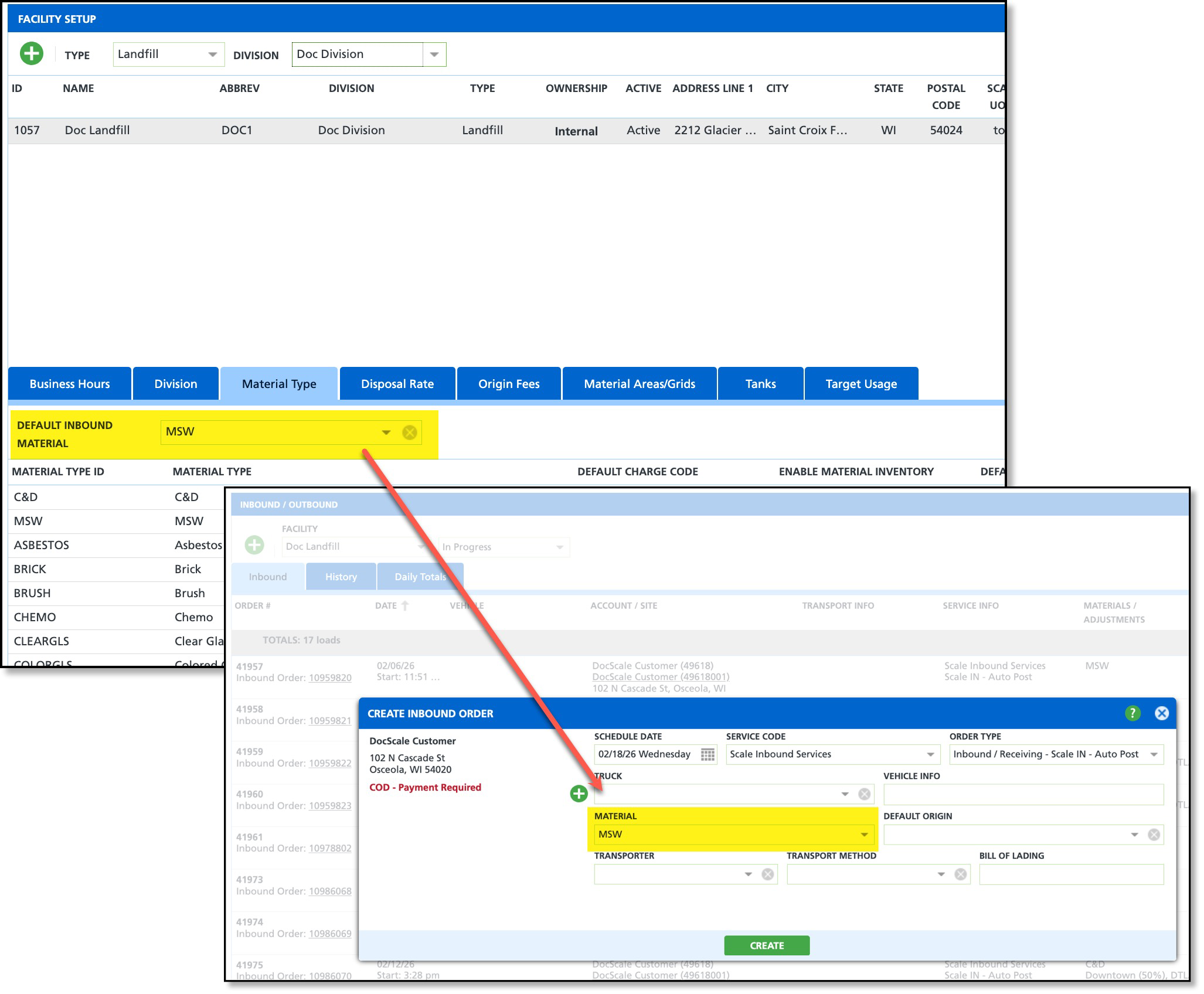 An issue has been resolved that was preventing the material set as the Default Inbound Material at the facility from appearing as the default when a new inbound work order is created.