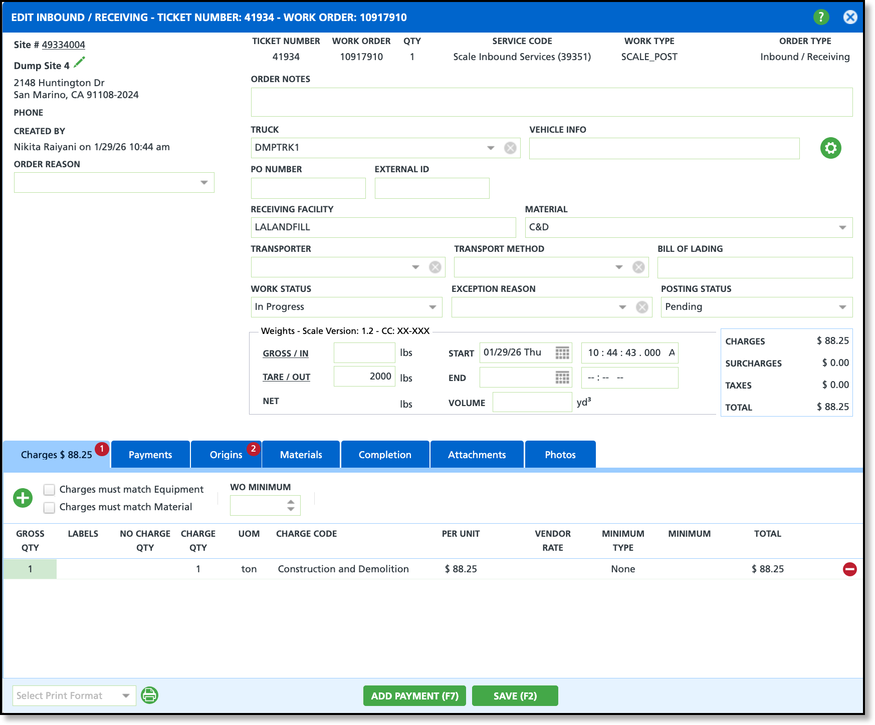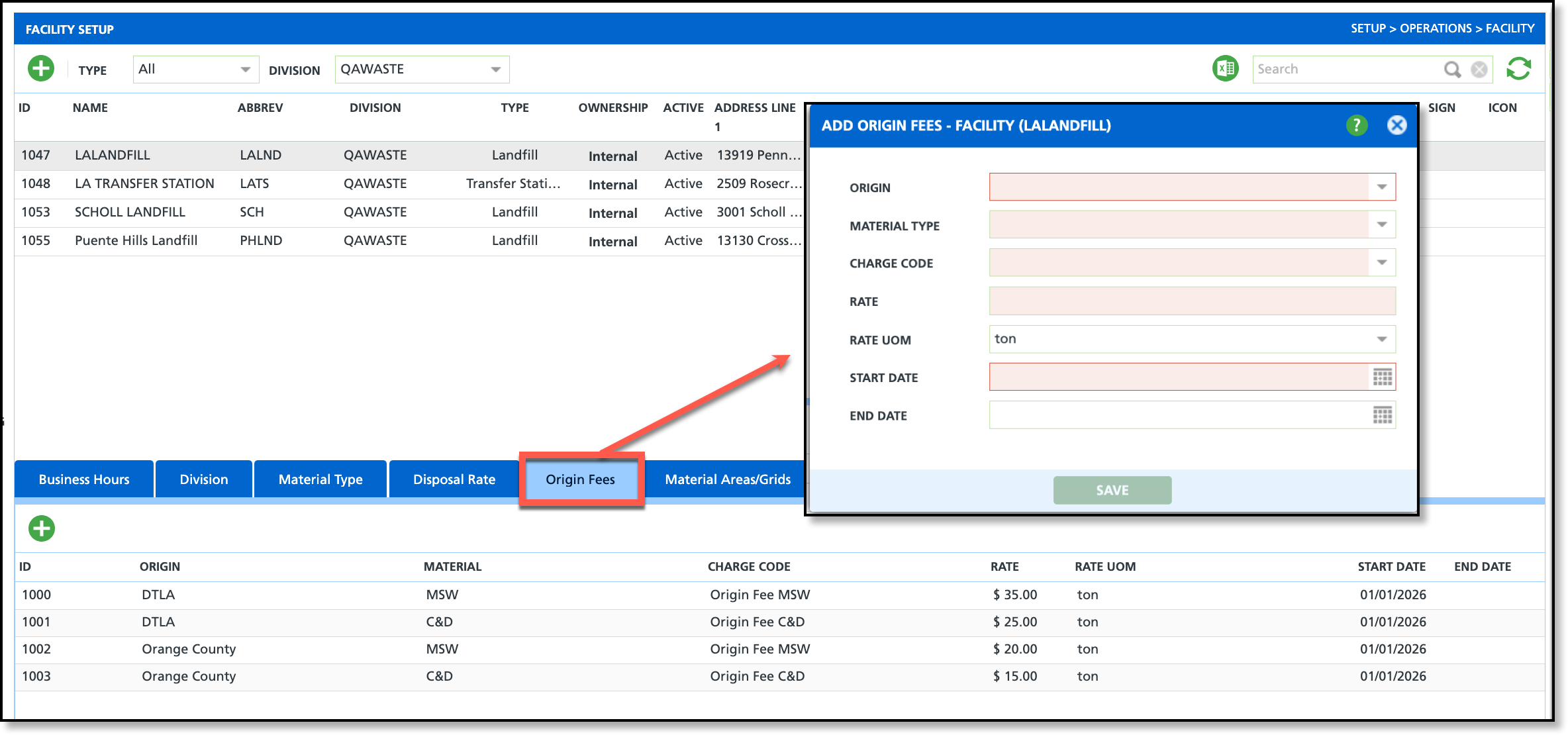 New logic has been added to automatically calculate and recalculate origin-based fees on Service Records when Net Weight, Material, or Origin information is entered or updated. To support this, a new Origin Fees tab has been added to Facility Setup, further detailed below.