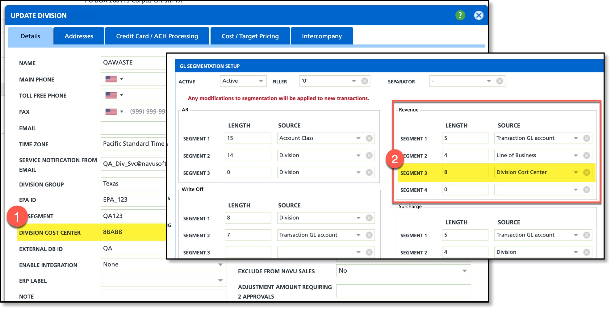 - 'Division Cost Center' was added to the Revenue segments 1 through 4 (Length of 8) in GL Segmentation Setup.