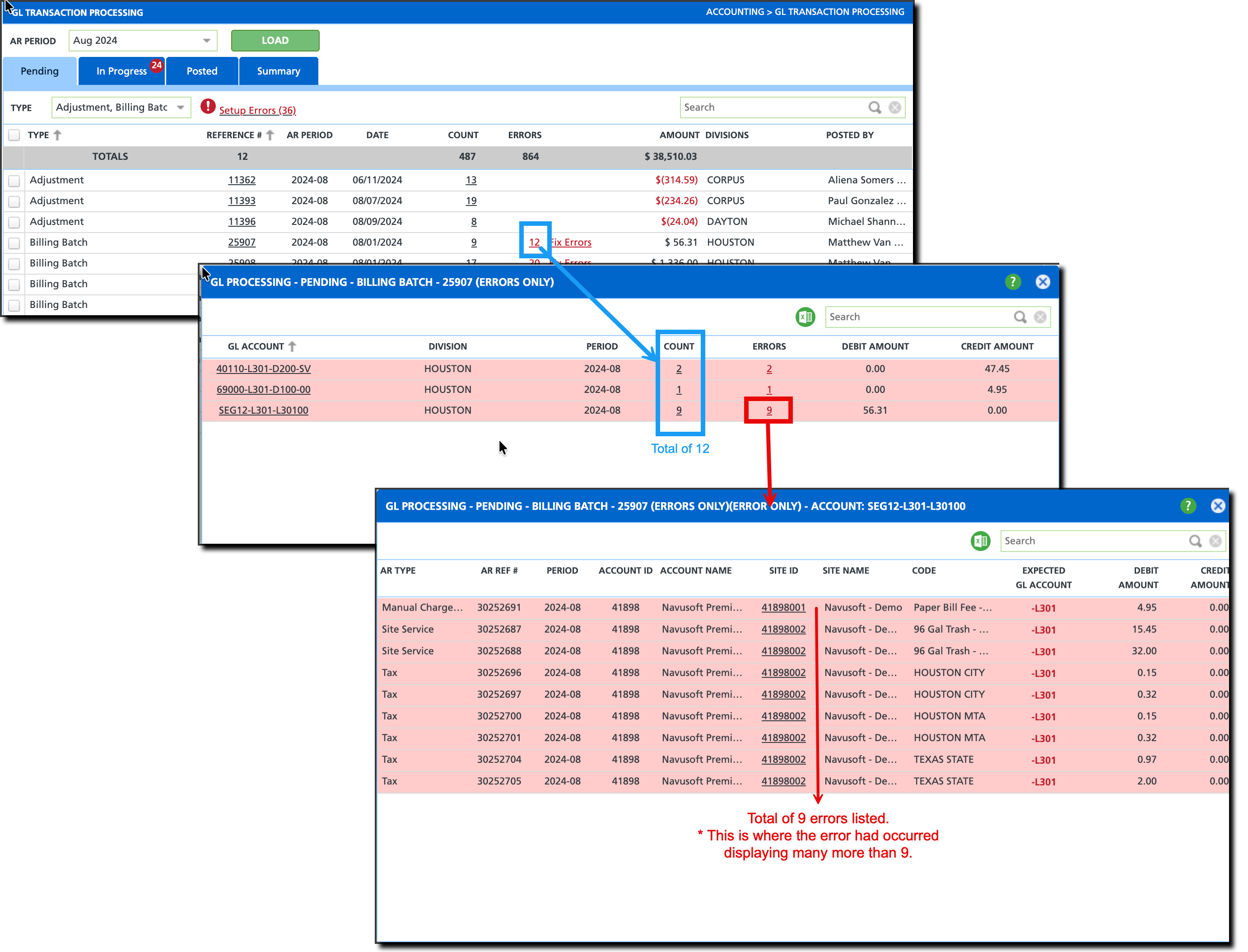 The issue with the detailed list of Errors displayed for a selected GL Account showing more results than expected has been resolved. The Errors hyperlink number and the number of errors listed should match.