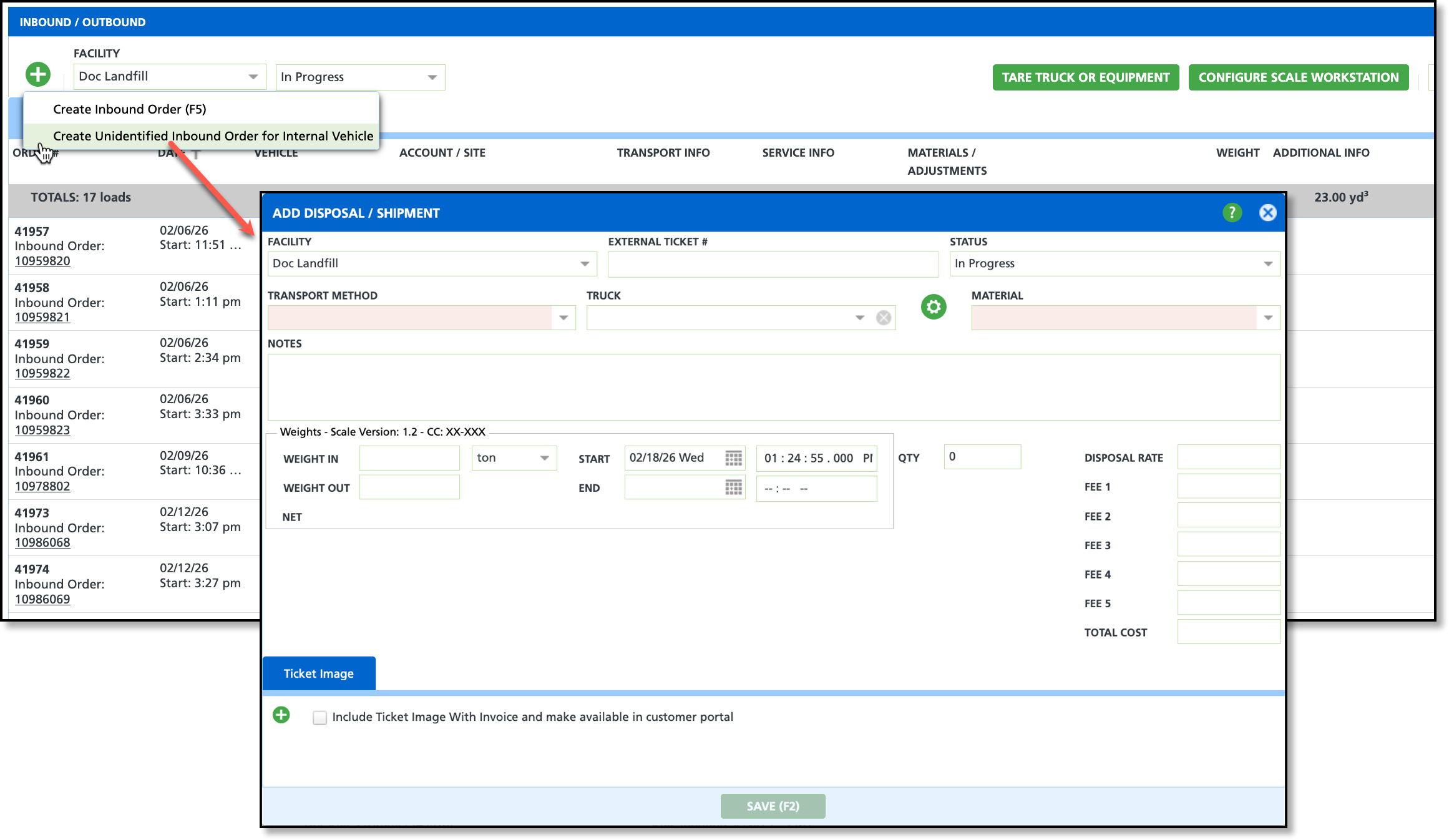 - From the Inbound screen, select the 'Create Unidentified Inbound Order for Internal Vehicle' option. This will display the Add Disposal / Shipment popup.
