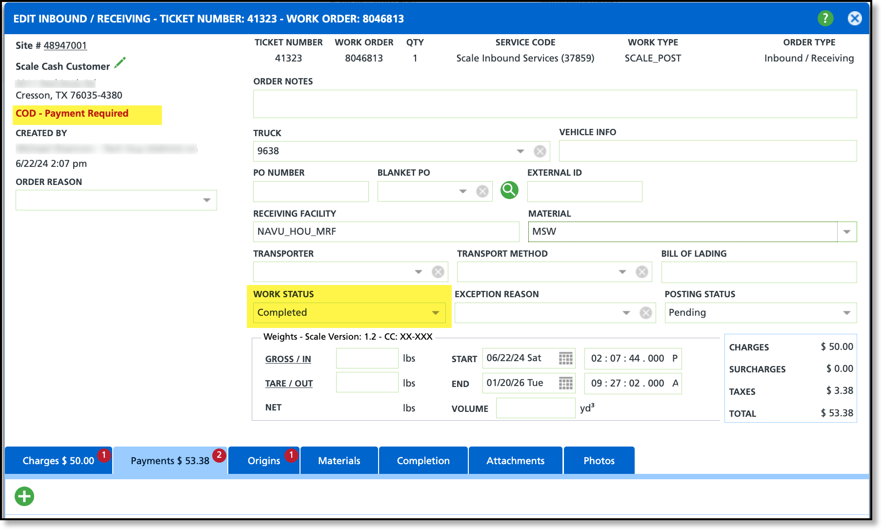 The logic for completing Cash on Delivery (COD) scale tickets using the F2 hotkey has been updated to enforce COD payment requirements. COD tickets with charges can still be saved using F2, but they will no longer complete until payment is received.
