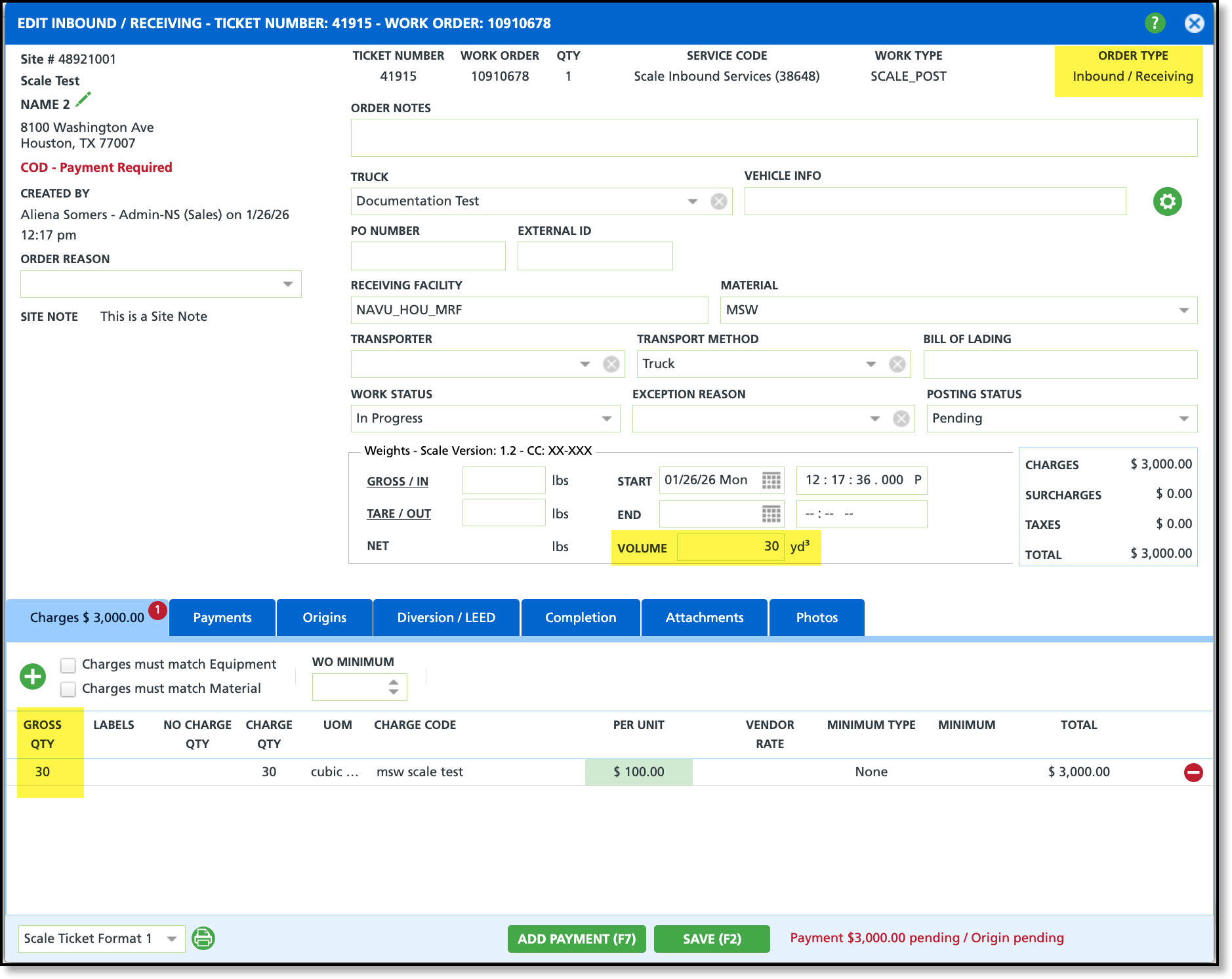 - For charge calculation, the material on the inbound ticket must match the charge code material type, and the charge code Rate UOM must be a volume-based unit of measure. When these conditions are met, the recorded volume is used to populate the gross quantity for the charge, applying the same calculation rules as existing weight-based logic.