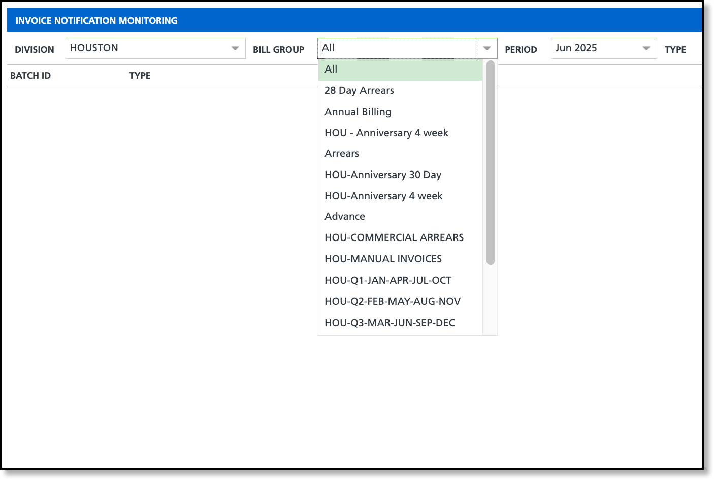 An issue has been resolved that prevented the Bill Group filter in Invoice Notification Monitoring from limiting the displayed bill groups based on the selected Division filter.