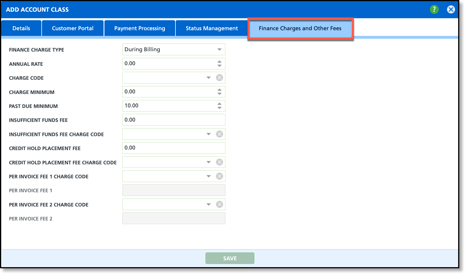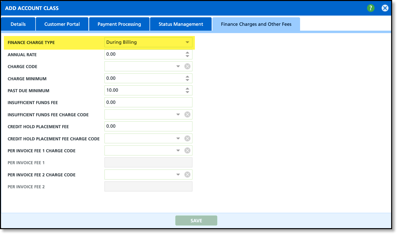 Pathway: Setup > Account > Account Class > Finance Charges and Other Fees