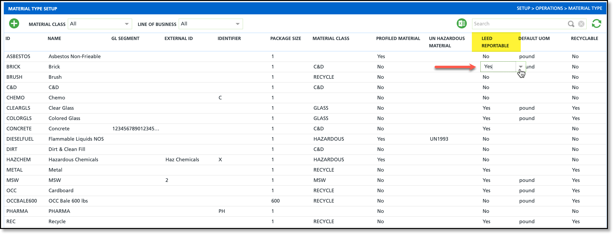 Review each material type and set the LEED Reportable option to Yes for any materials that should be included in LEED reporting.