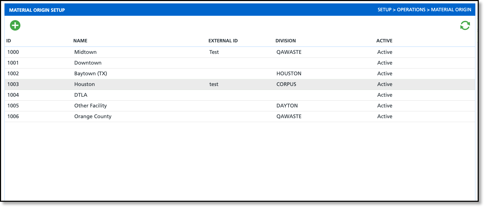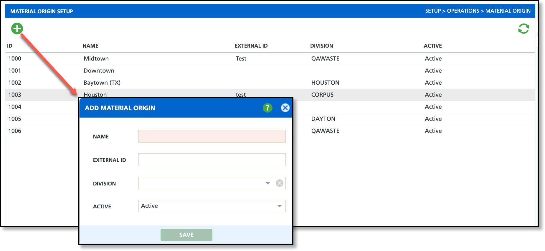 Material Origins can be quickly added by selecting the green Add icon from the Material Origin Setup screen. At a minimum, only a name is required to create an origin. Selecting a Division restricts where the origin can be used; if left blank, the origin is available to all sites and facilities origin can be assigned.