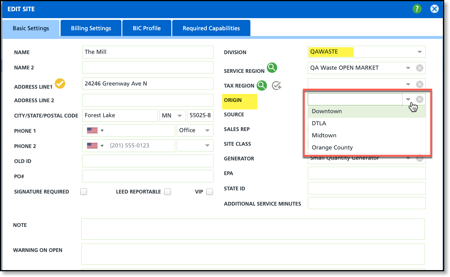 An origin will display only when its assigned division matches the division of the facility. If no division is assigned to the origin (the Division field is blank), the origin will display for all facilities.