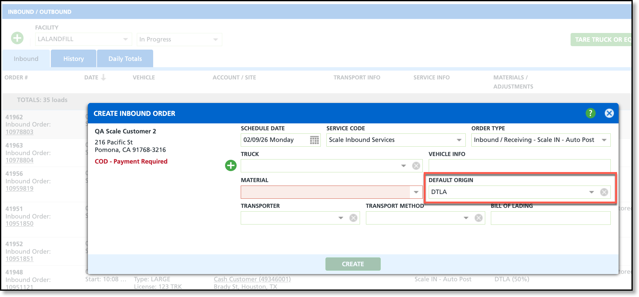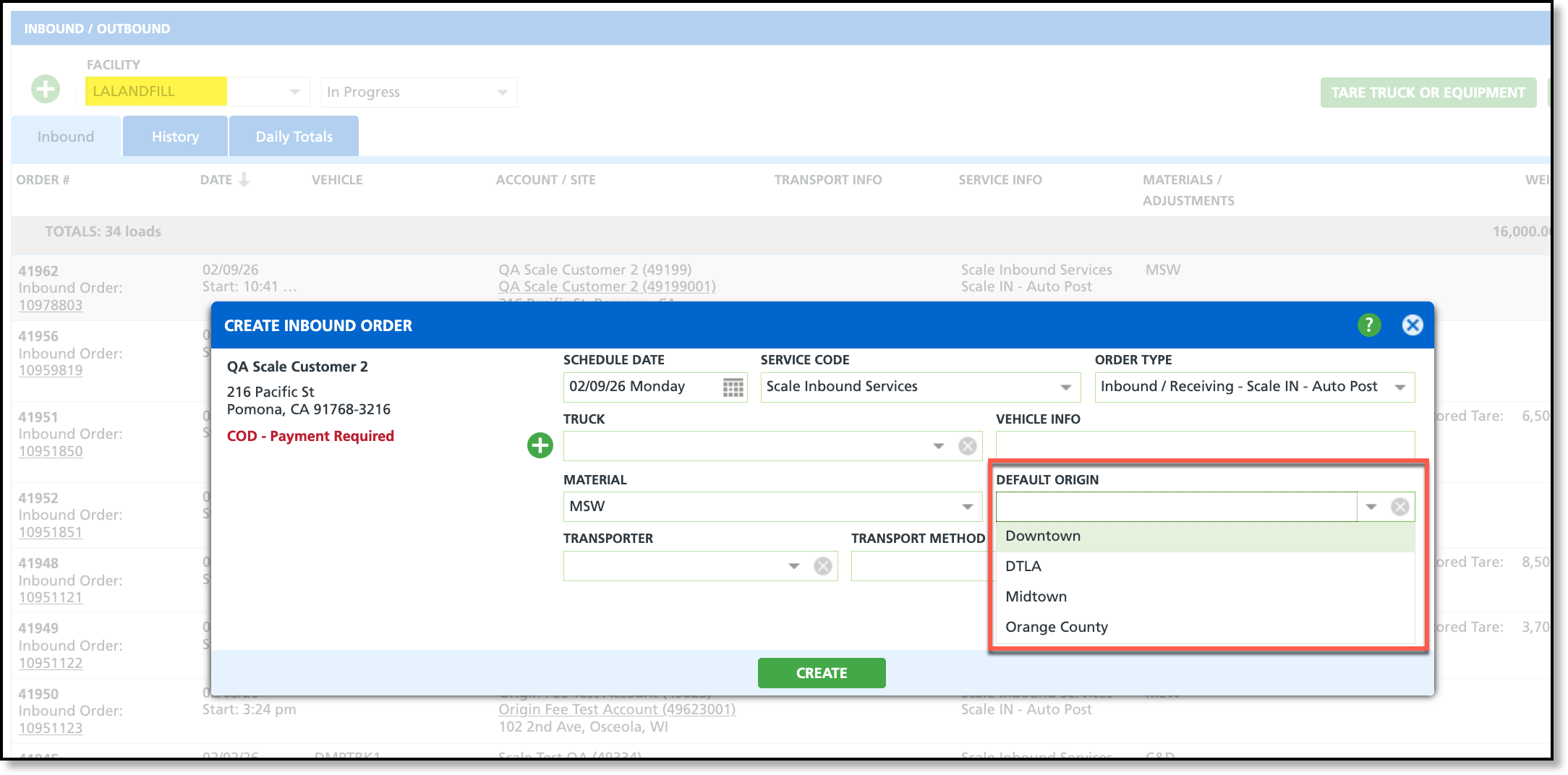 On the Create Inbound Order screen, the Default Origin field is displayed when setup requirements are met; otherwise, the field is hidden. If the site associated with the ticket already has a default origin set in Site Details, the origin is automatically populated.
