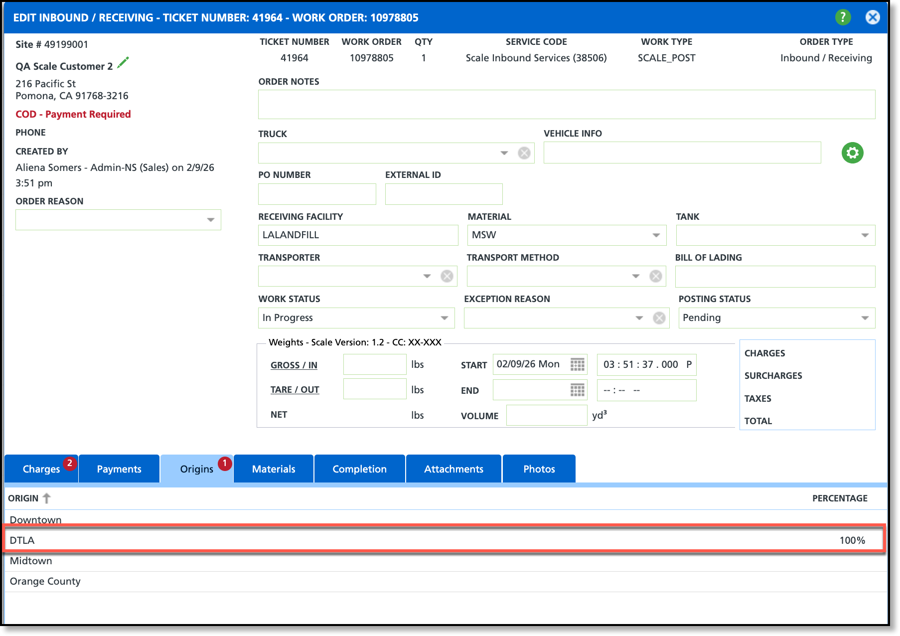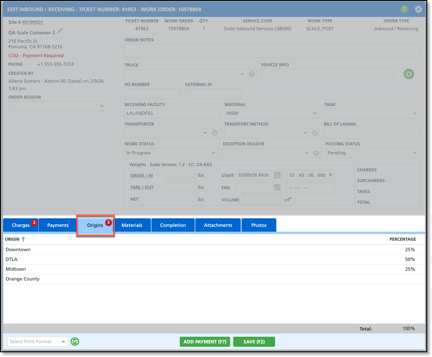On the Inbound / Outbound screen, the Origin field is displayed in two places: first on the Create Inbound Order screen, where a default origin is selected for the ticket, and again on the Edit Inbound / Receiving screen, where percentages can be specified if the disposal includes material from more than one origin.