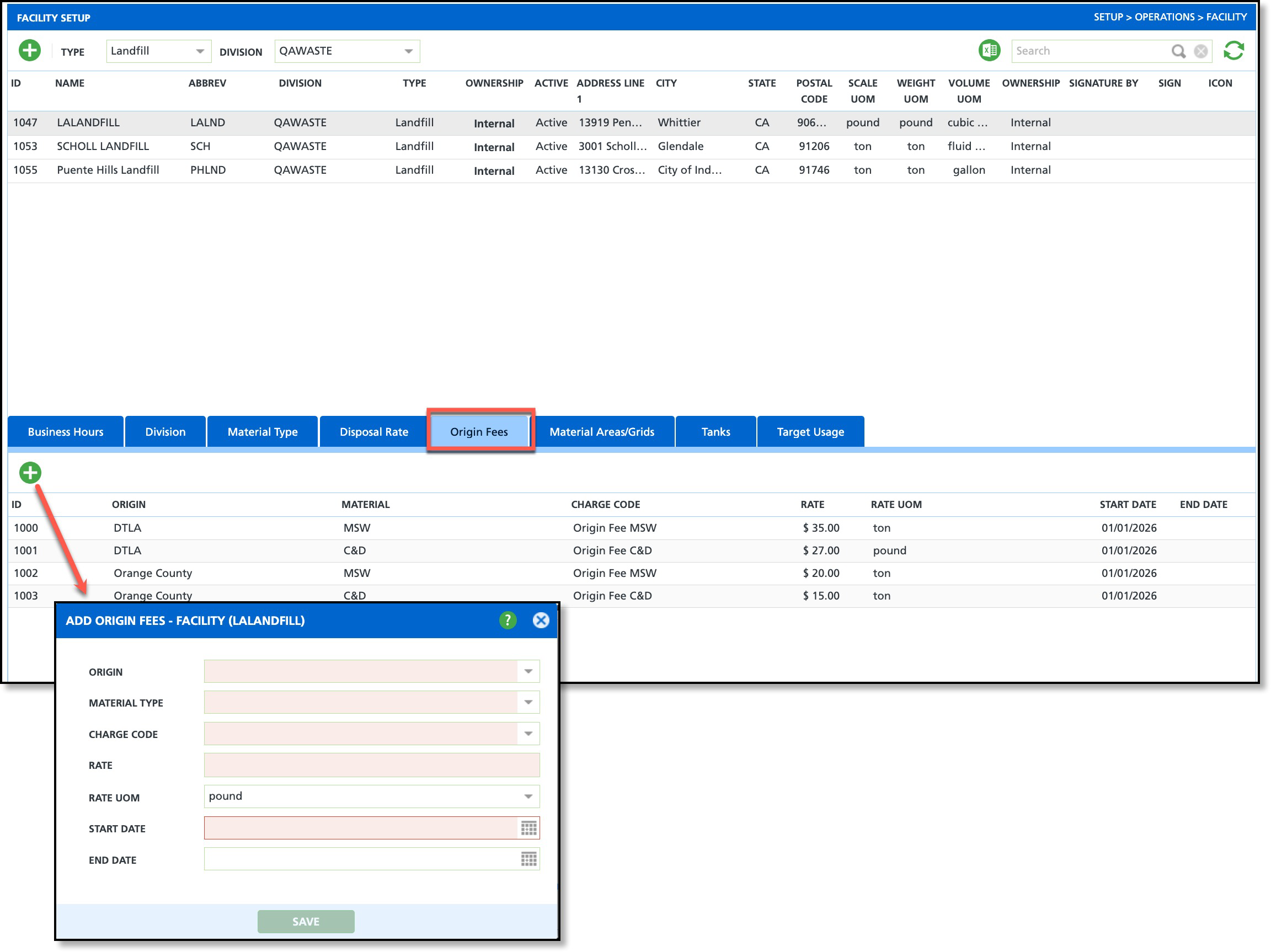 Add Origin Fees allows you to define origin-specific fees at the facility level. Configuring fees here enables multiple origin fees to be created for a single facility, each with its own rate, material type, charge code, and effective date range, providing flexibility to support varying pricing structures by origin.