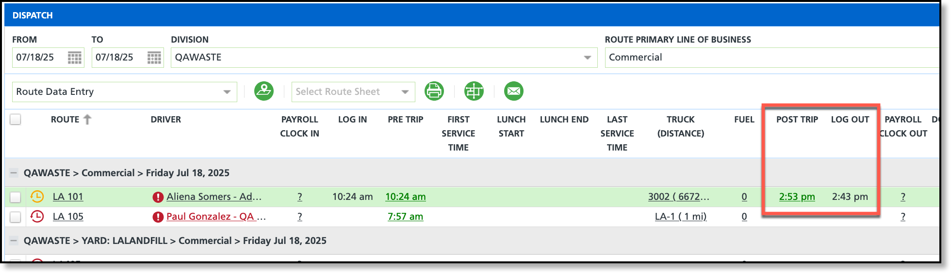 An issue has been resolved that prevented Post Trip and Log Out times from being reported in Dispatch.