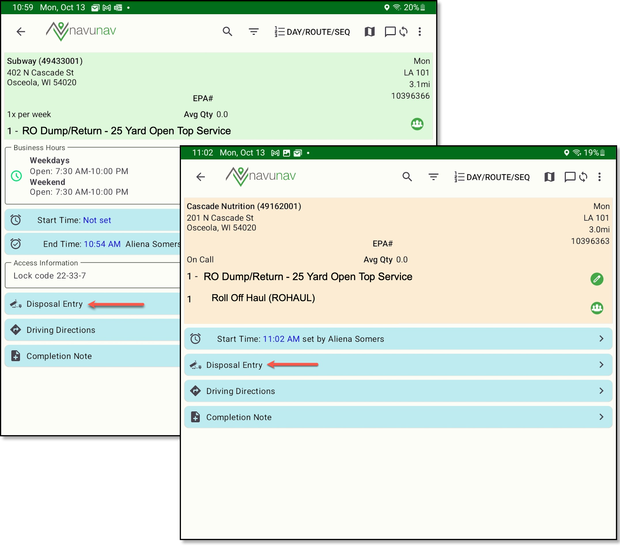 In previous versions of NavuNav (Android), the Disposal Entry option was only available once a work order was marked Complete. In version 6.6, this functionality has been expanded to also display for work orders with an In Progress status. Disposal Entry continues to display only for work types that require disposal.