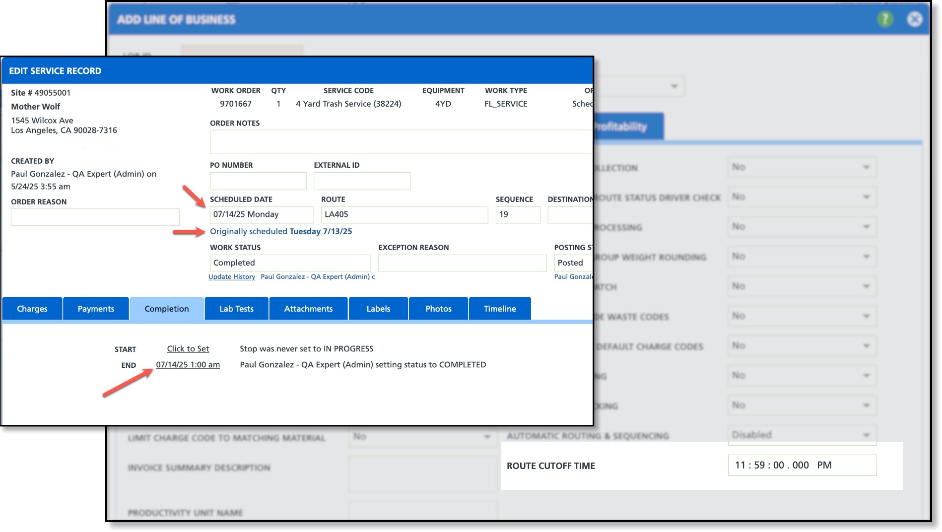 In the example below, the original scheduled date was 7/13/25, and the Route Cutoff Time was set to 11:59 PM. The service was completed around 1:00 AM on 7/14/25, the Scheduled Date was updated to 7/14/25.